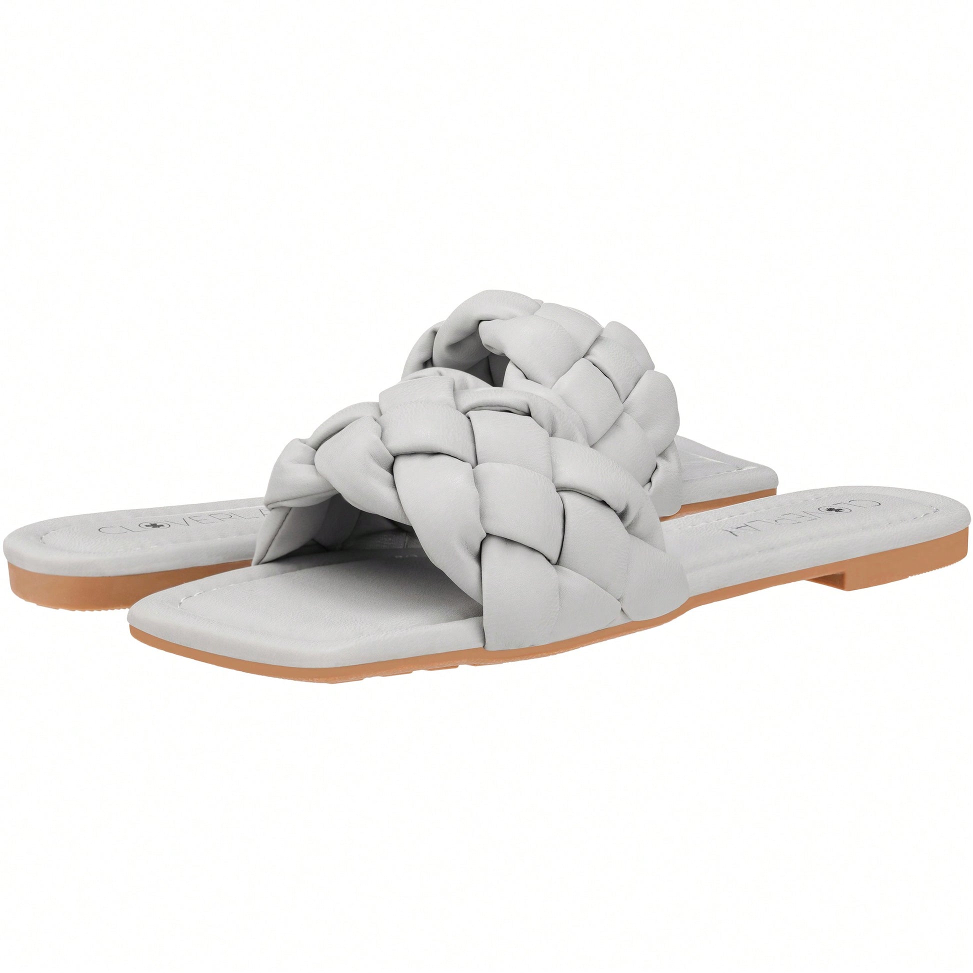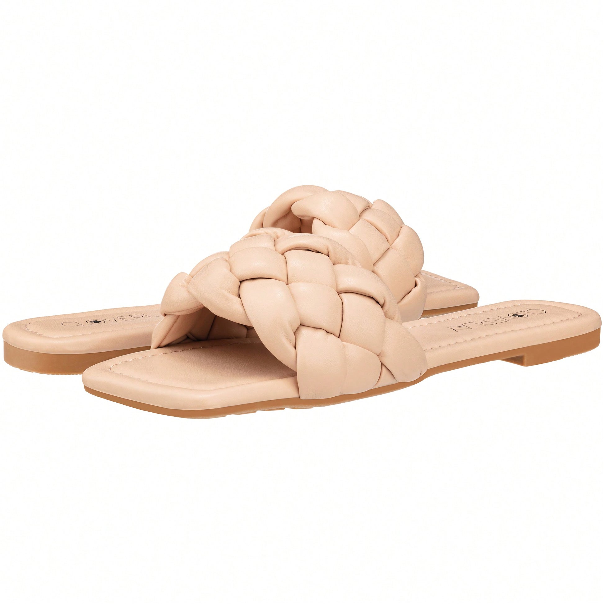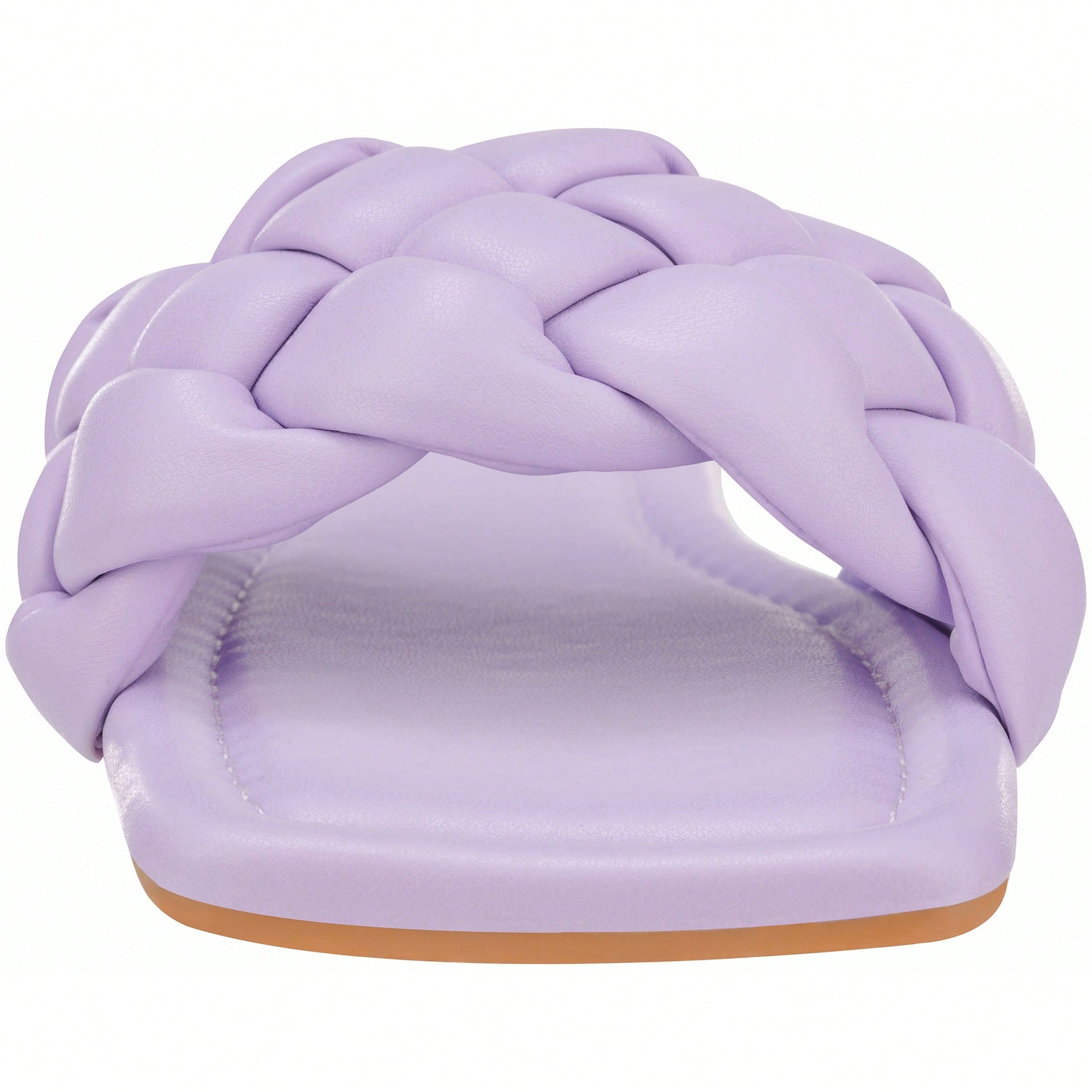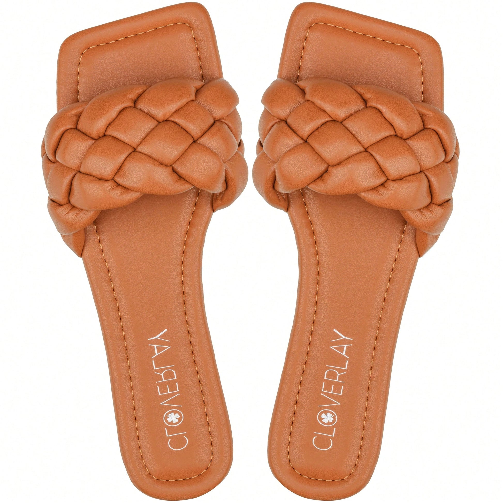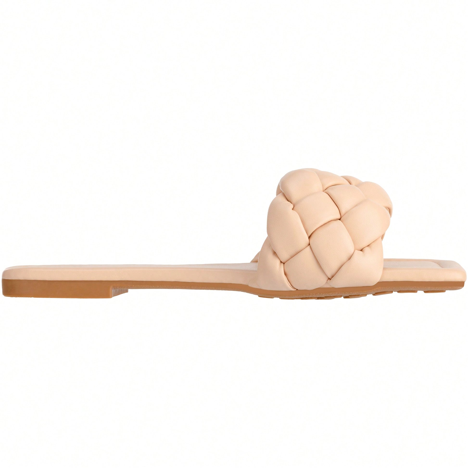 Women Braided Design Single Band Flat Sandals Open Toe Slide Sandals Square Toe Woven Sandals