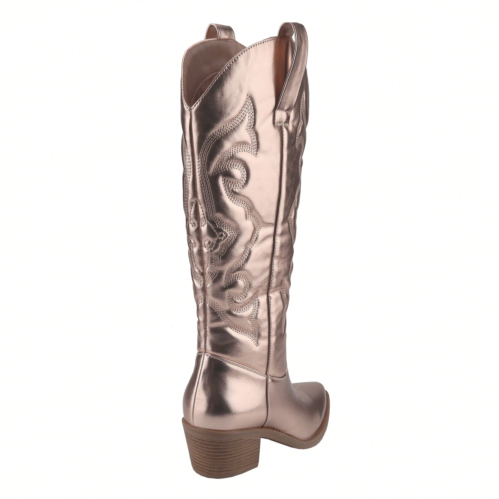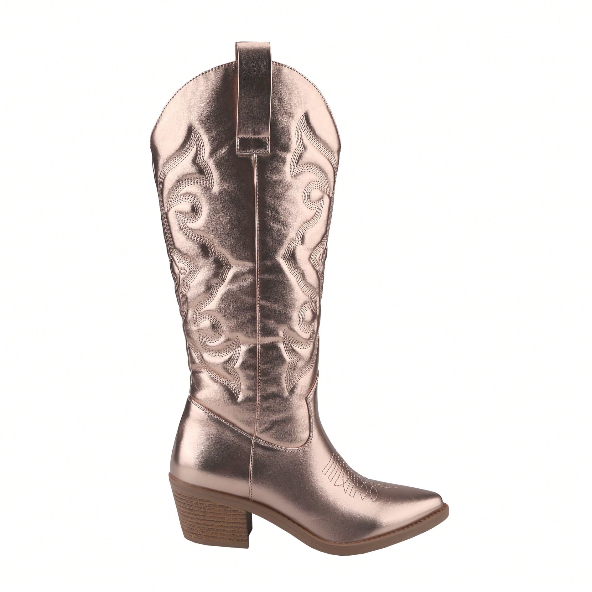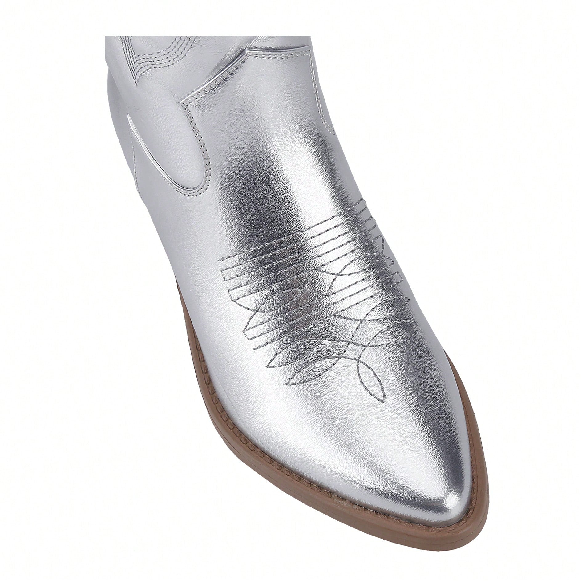 Women's Embroidered Western Cowboy Boots Mid Calf Pointed Toe Chunky Heel Shiny Vintage Fashion Knee Boots
