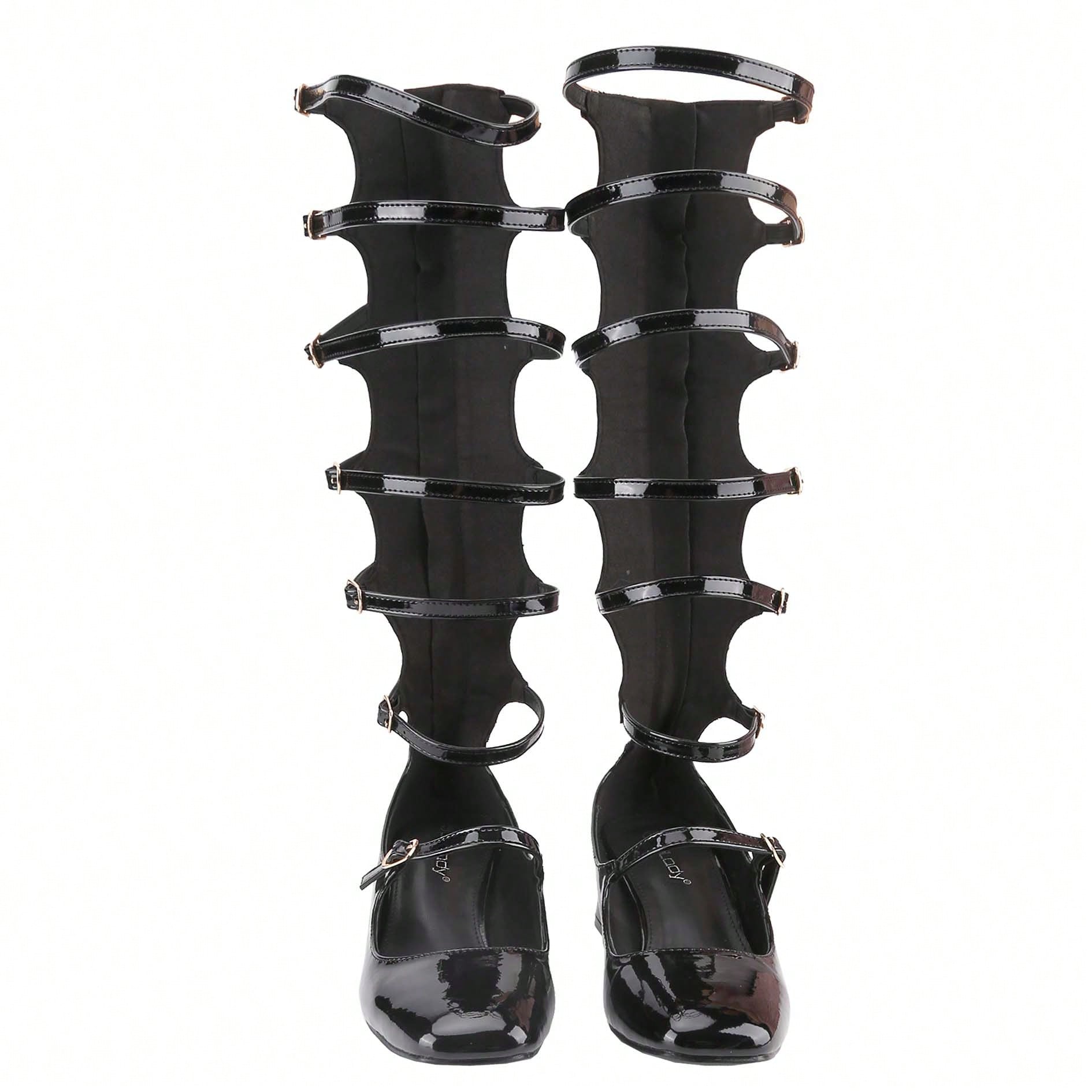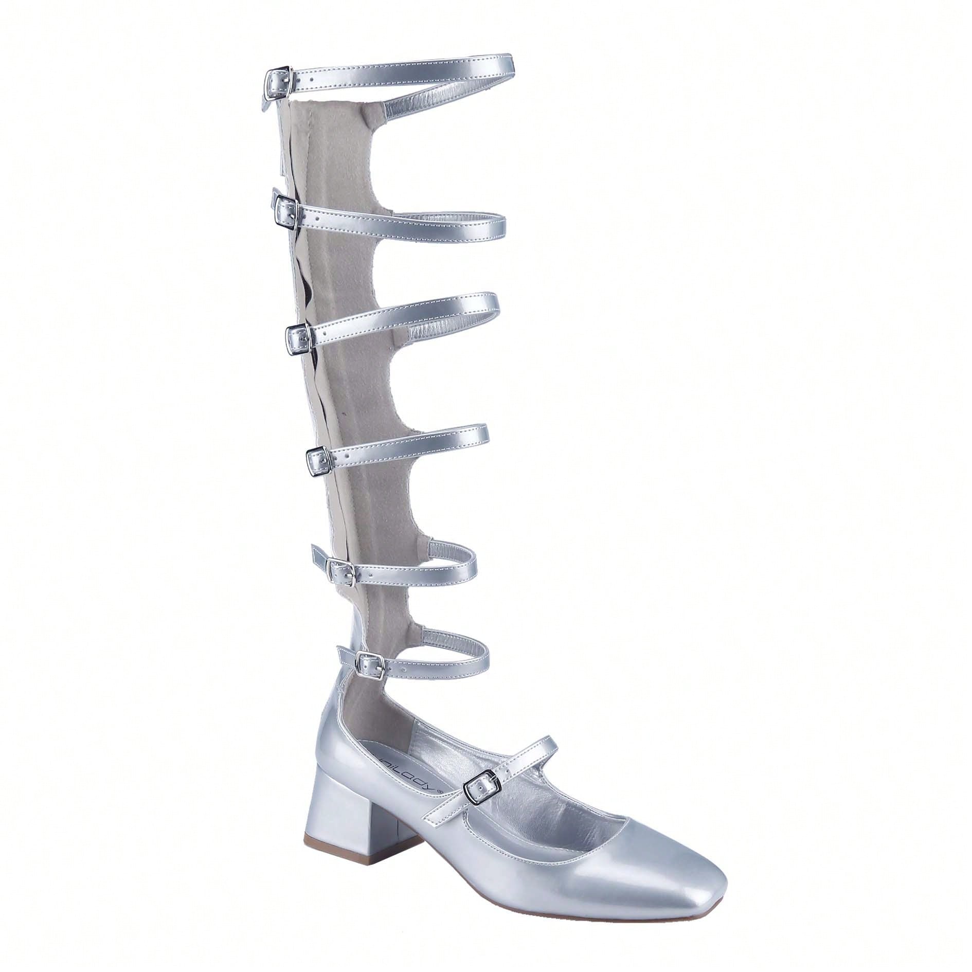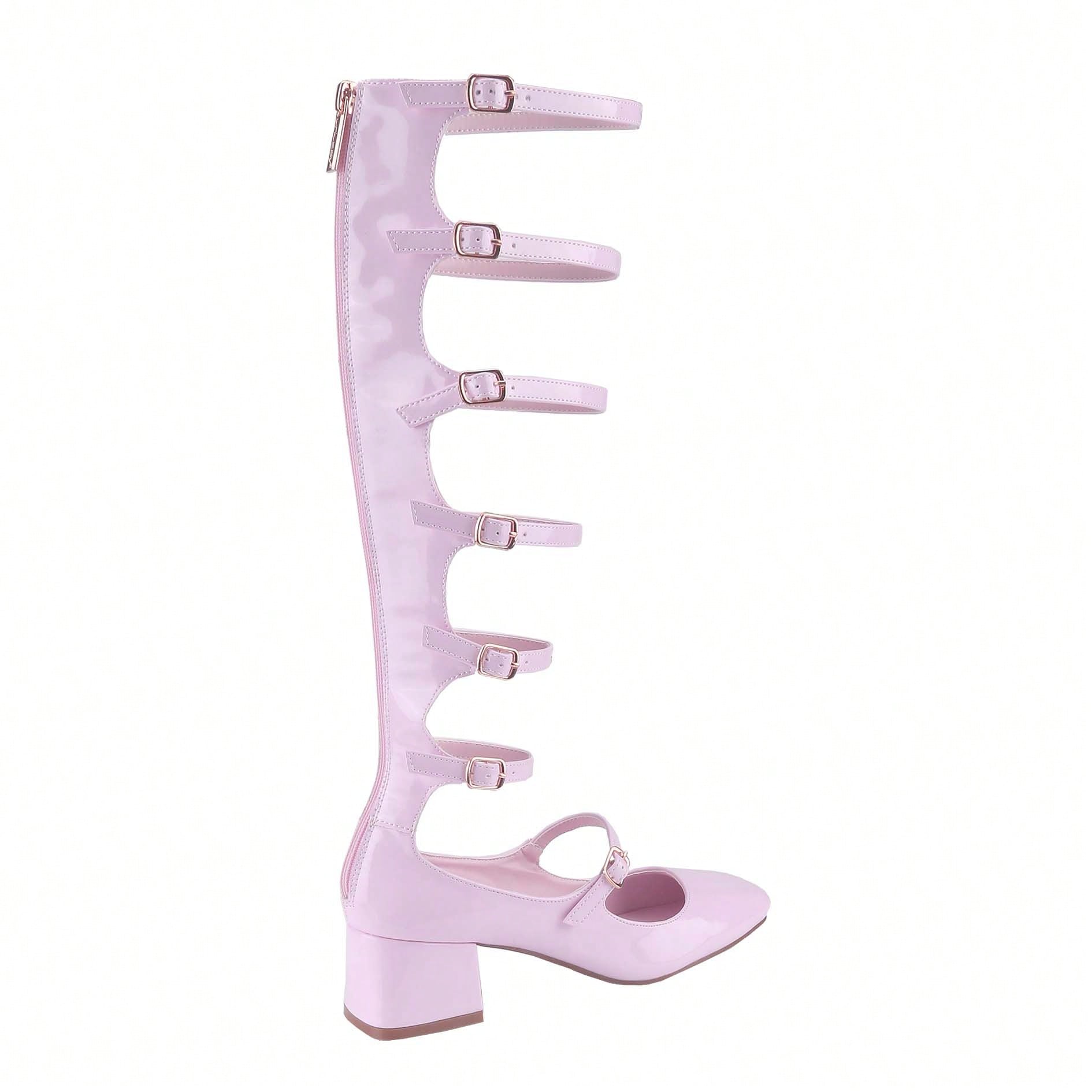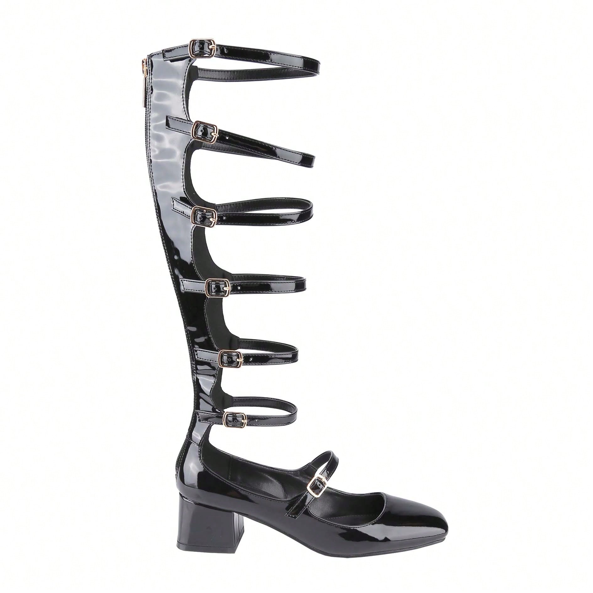 Women's Fashion Mary Janes,Closed Square Toe, Mid-Calf Strappy Gladiator, Low Block Heel