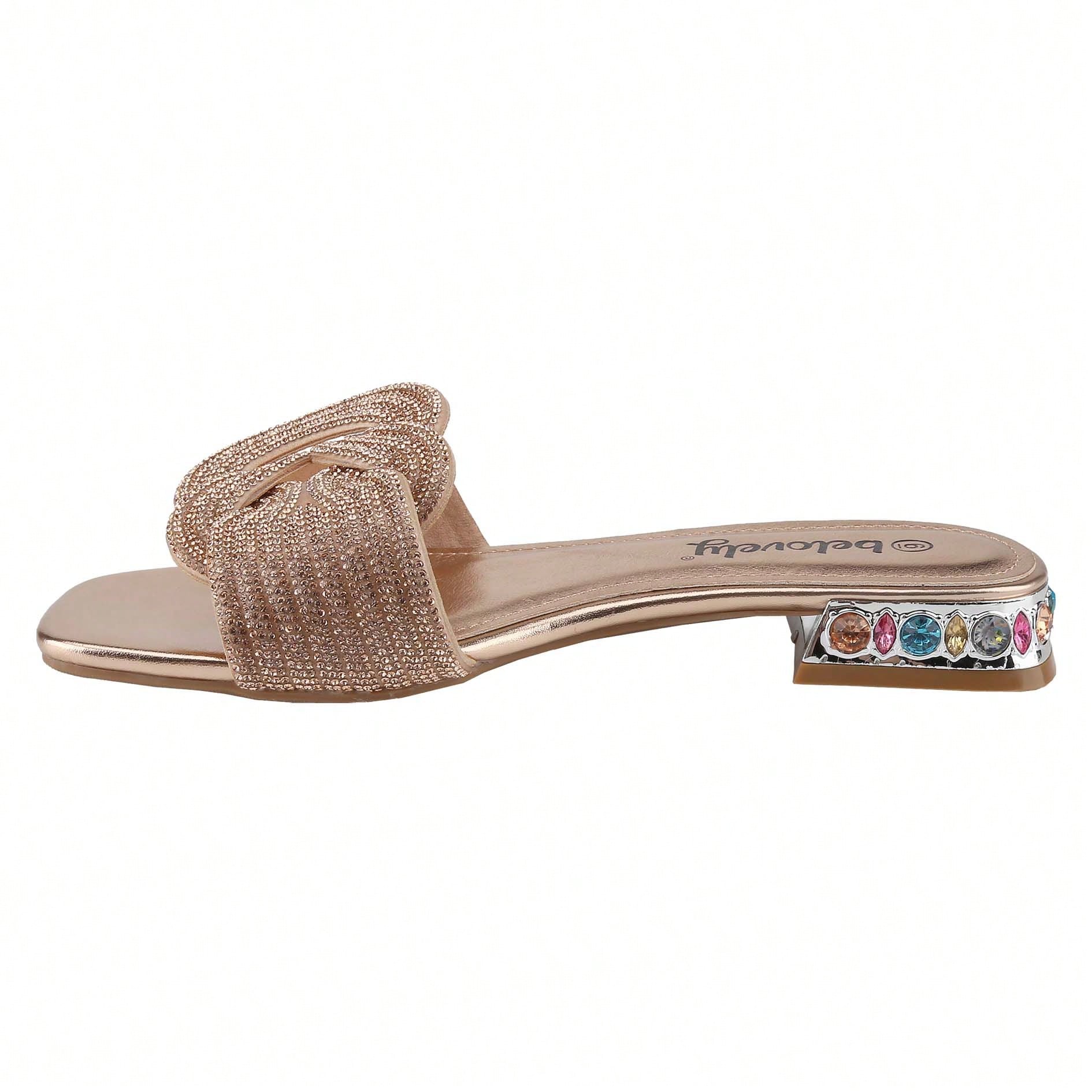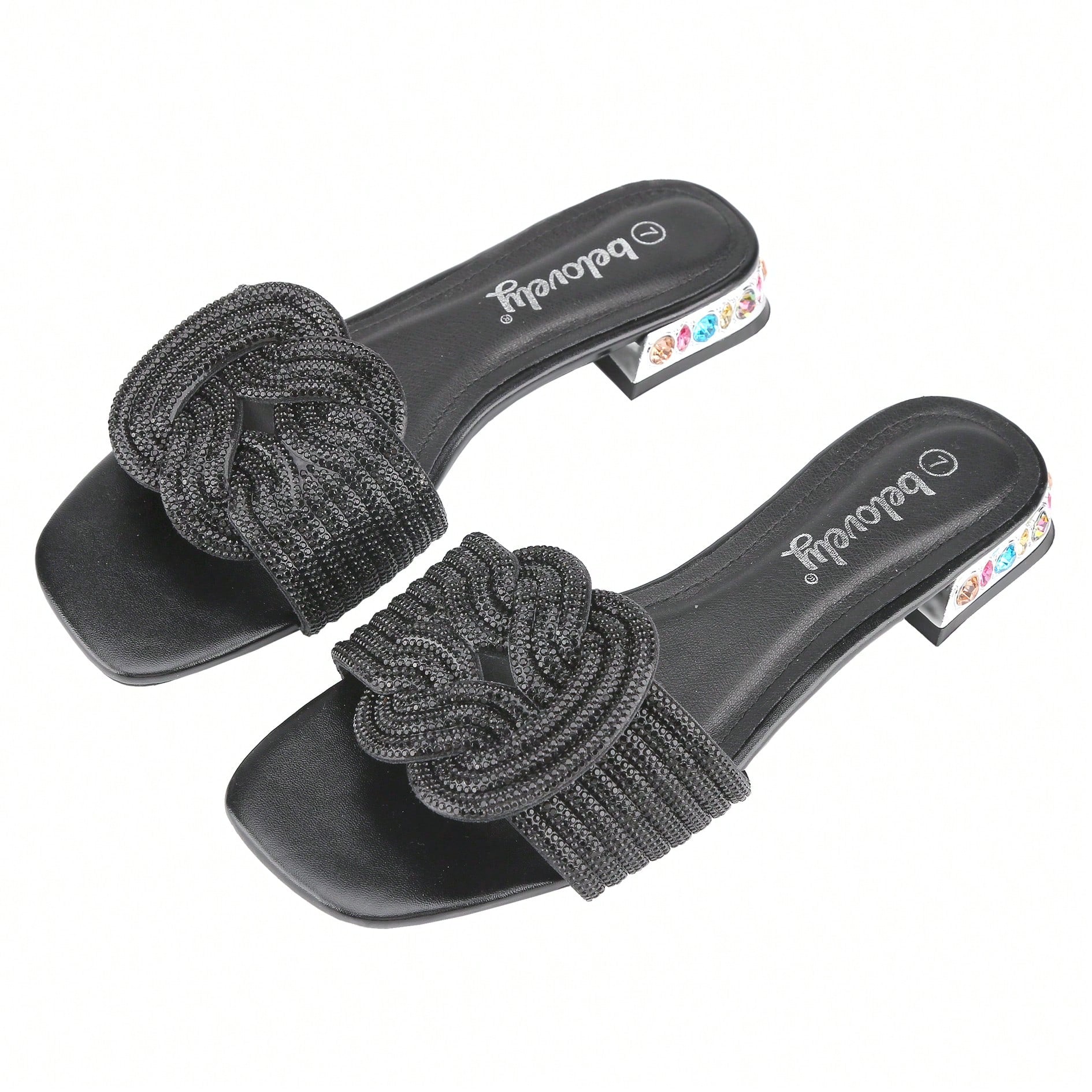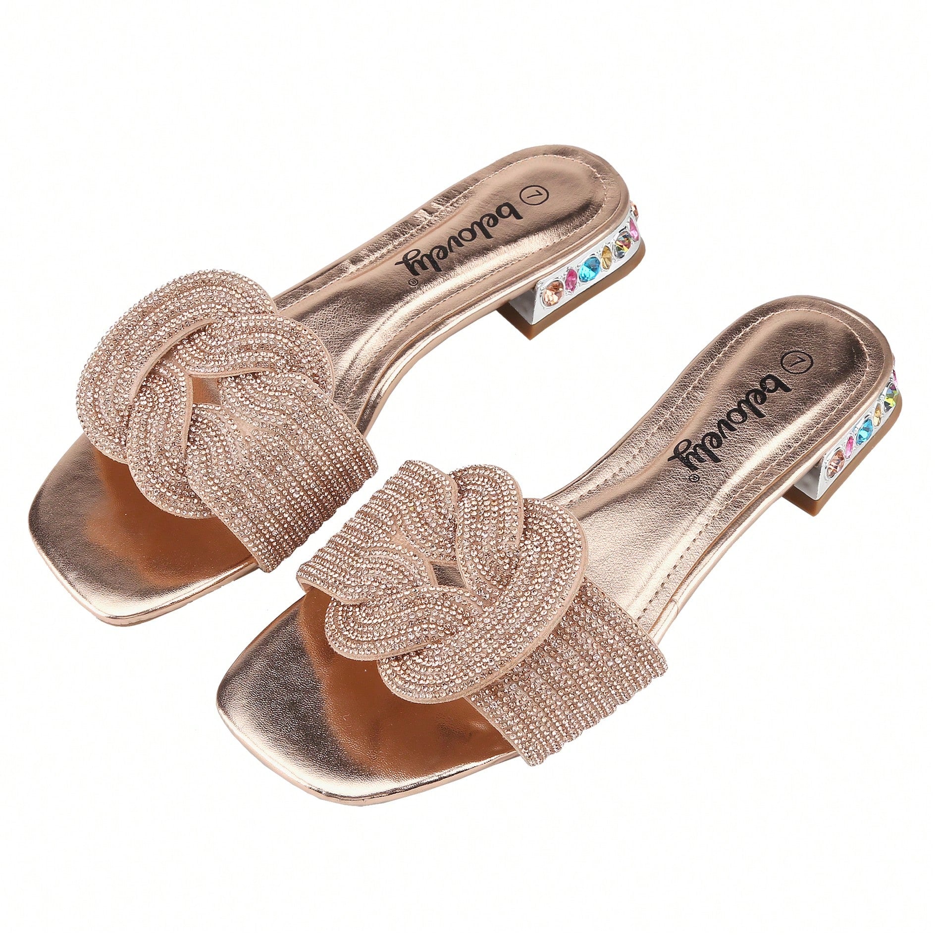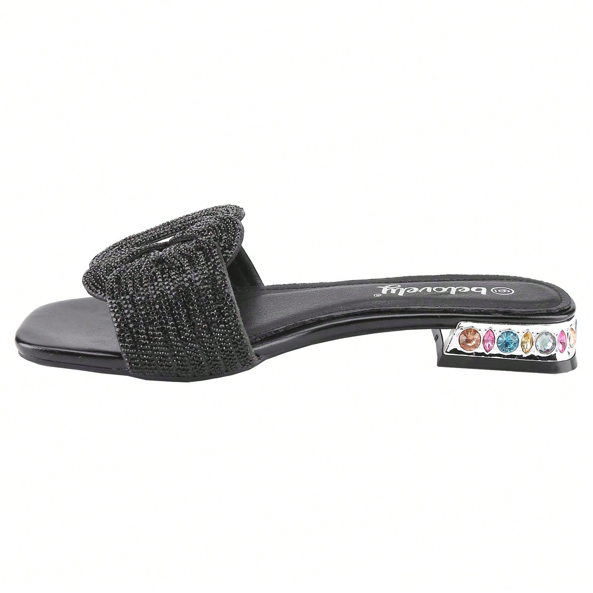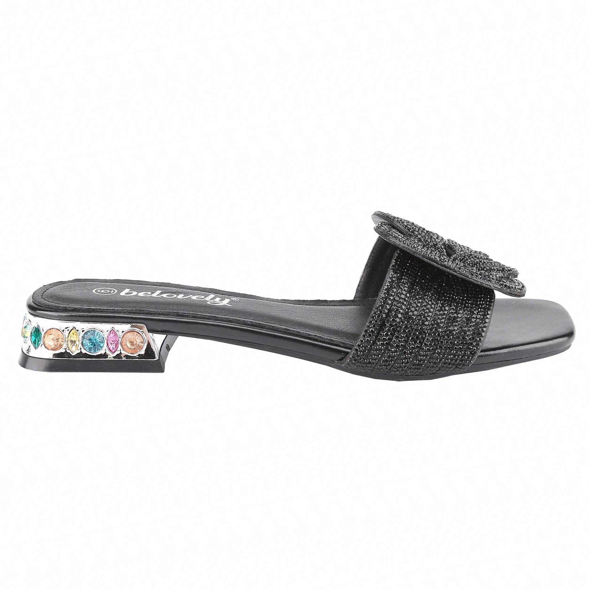 • These rhinestone womens sandals are complemented by an oversized woven applique buckle strap with rhinestones and gemstones on the heels. Play with proportion and pack a punch.