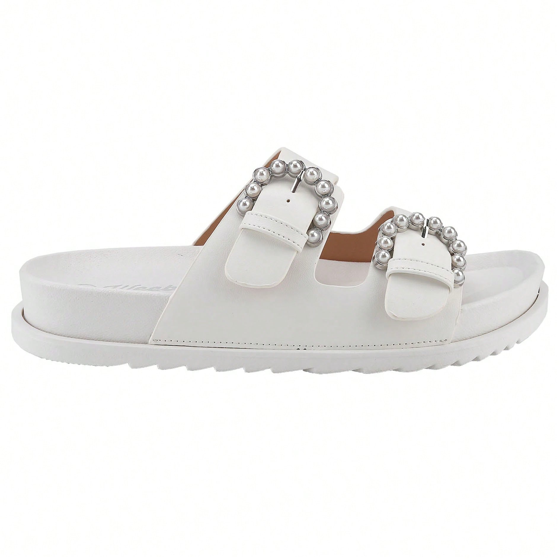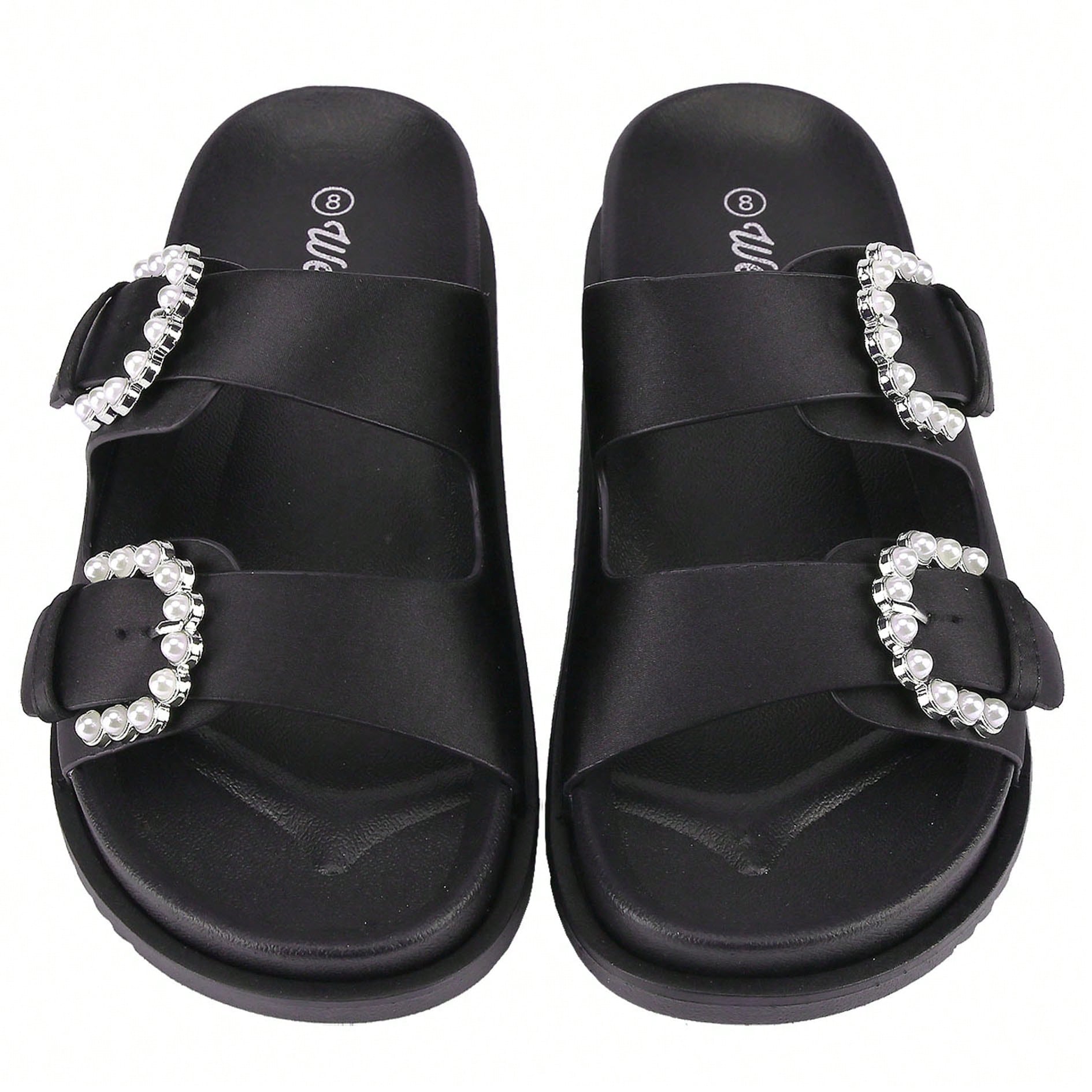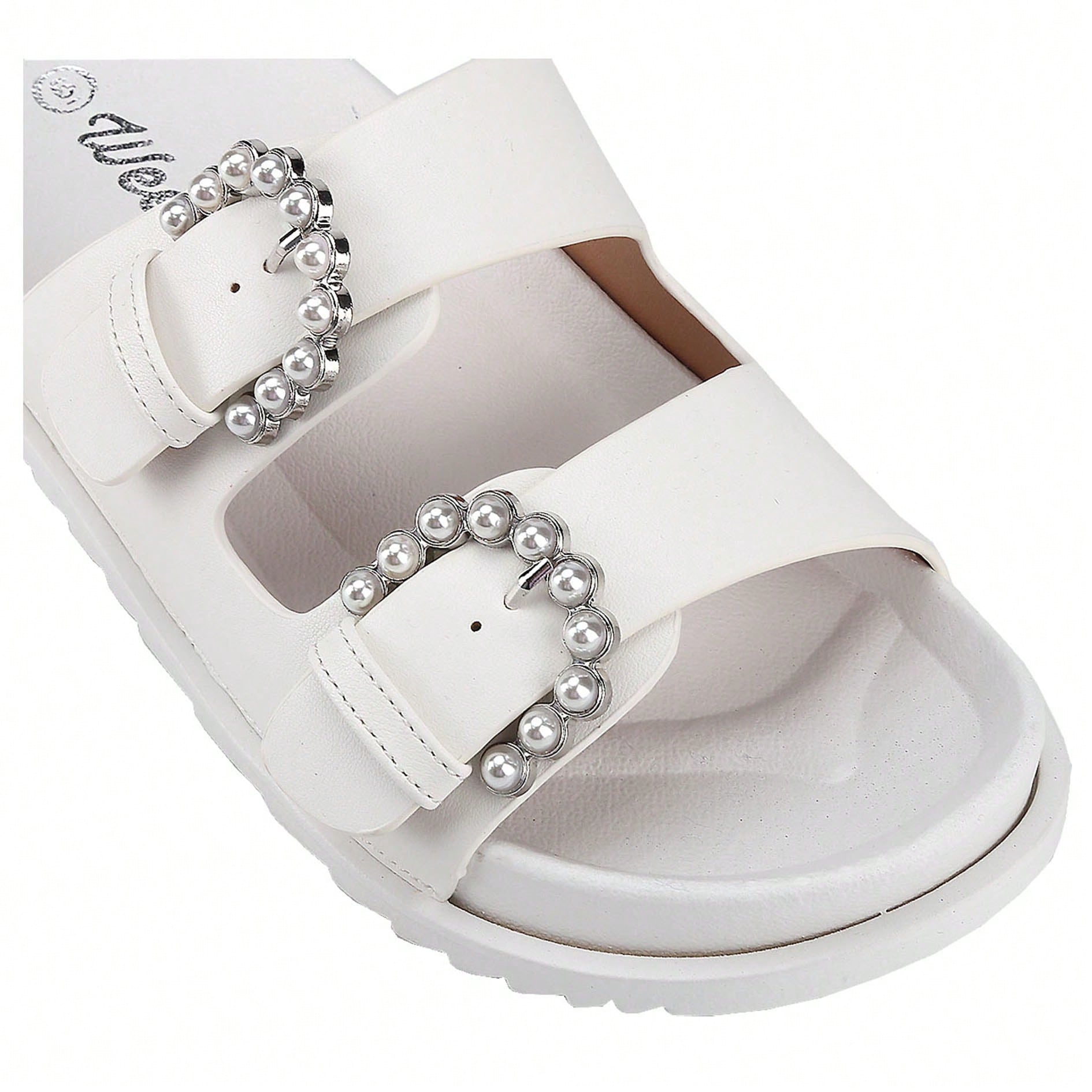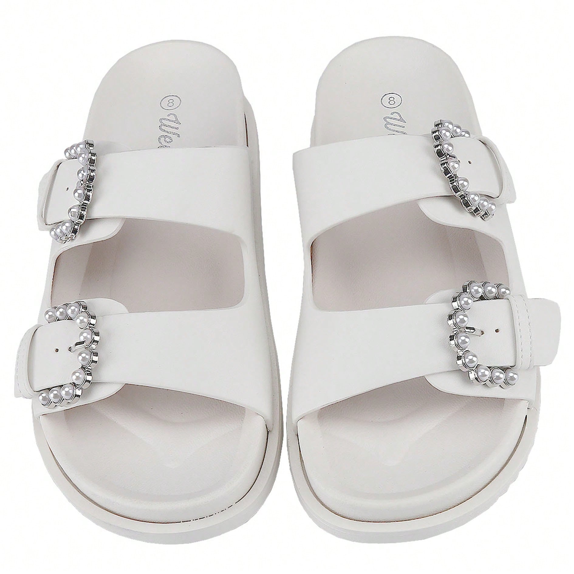 Women's Pearl Buckle Slides Women's Slides-Sandals Double Buckle Slip On-Summer-Slippers Adjustable Sandals Waterproof Swim Pool Bath Shower Shoes For Women Comfortable Non Slip