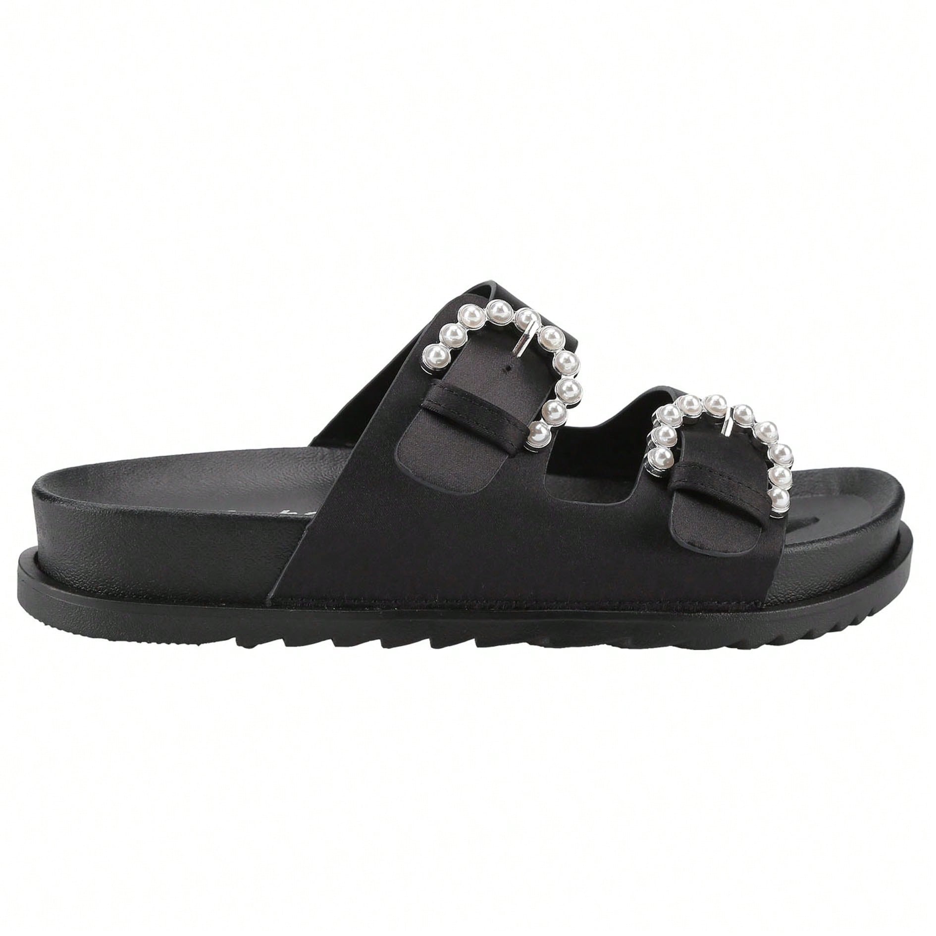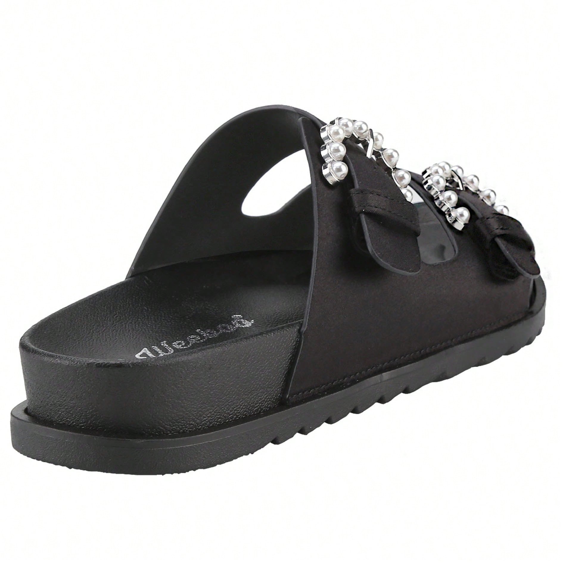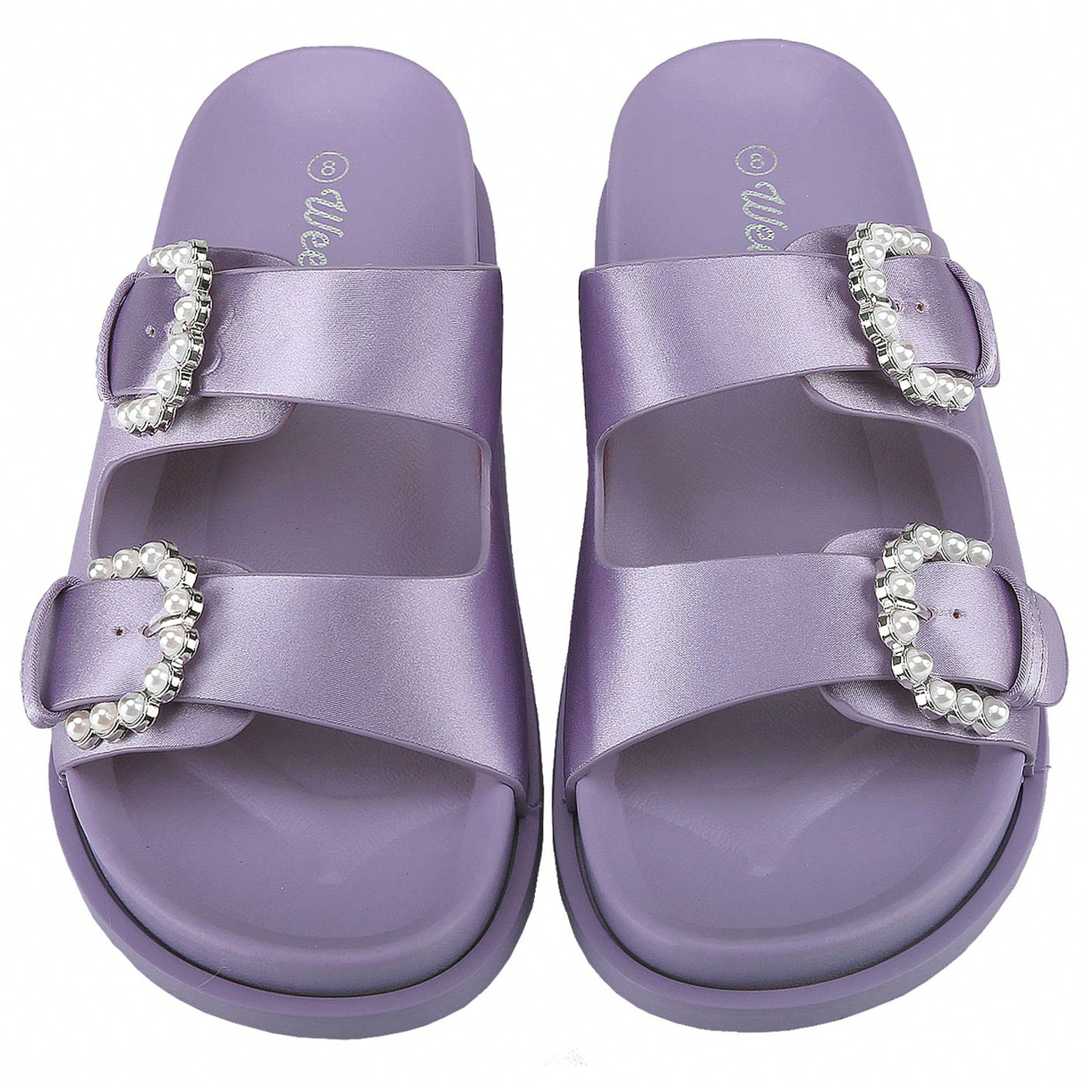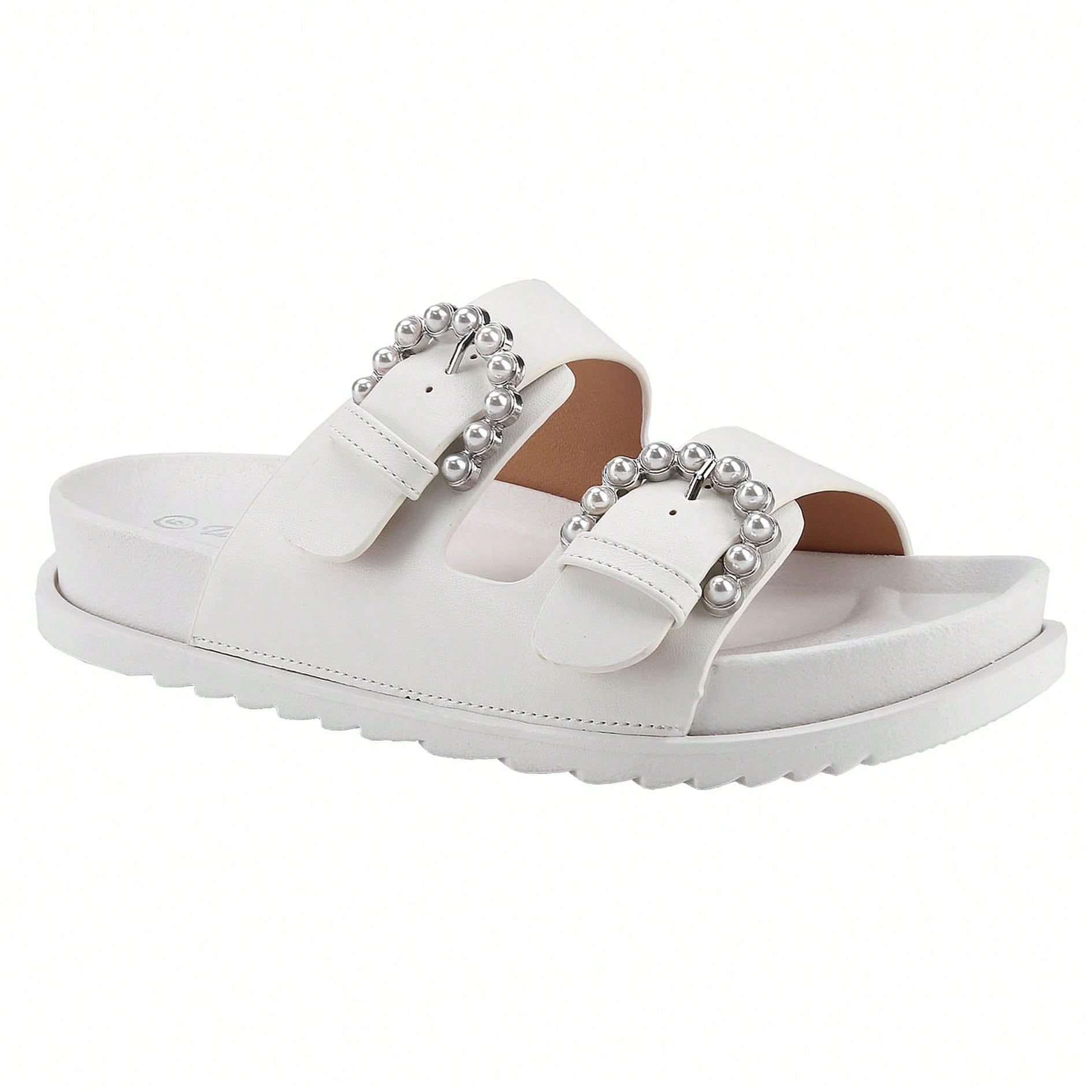 Women's Pearl Buckle Slides Women's Slides-Sandals Double Buckle Slip On-Summer-Slippers Adjustable Sandals Waterproof Swim Pool Bath Shower Shoes For Women Comfortable Non Slip