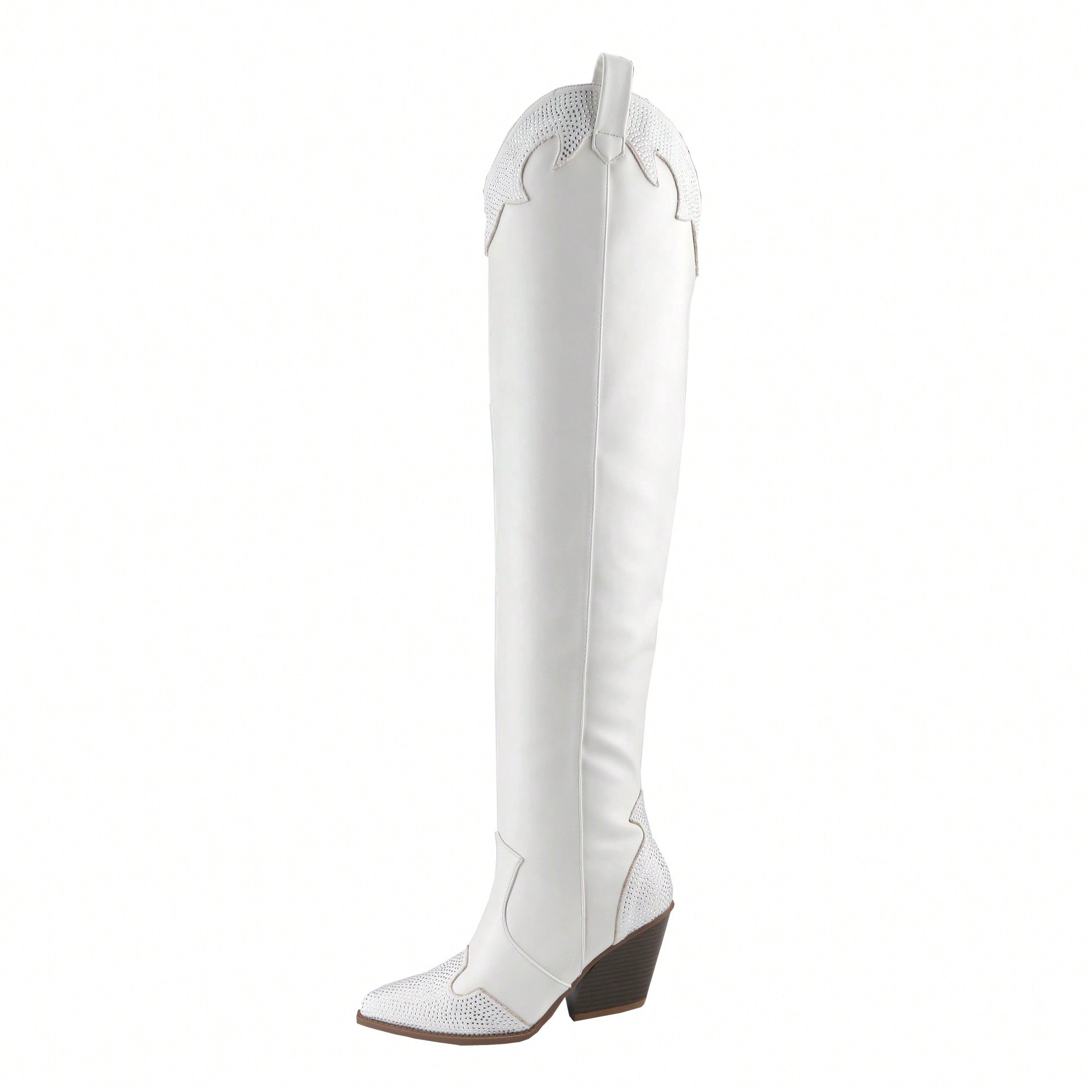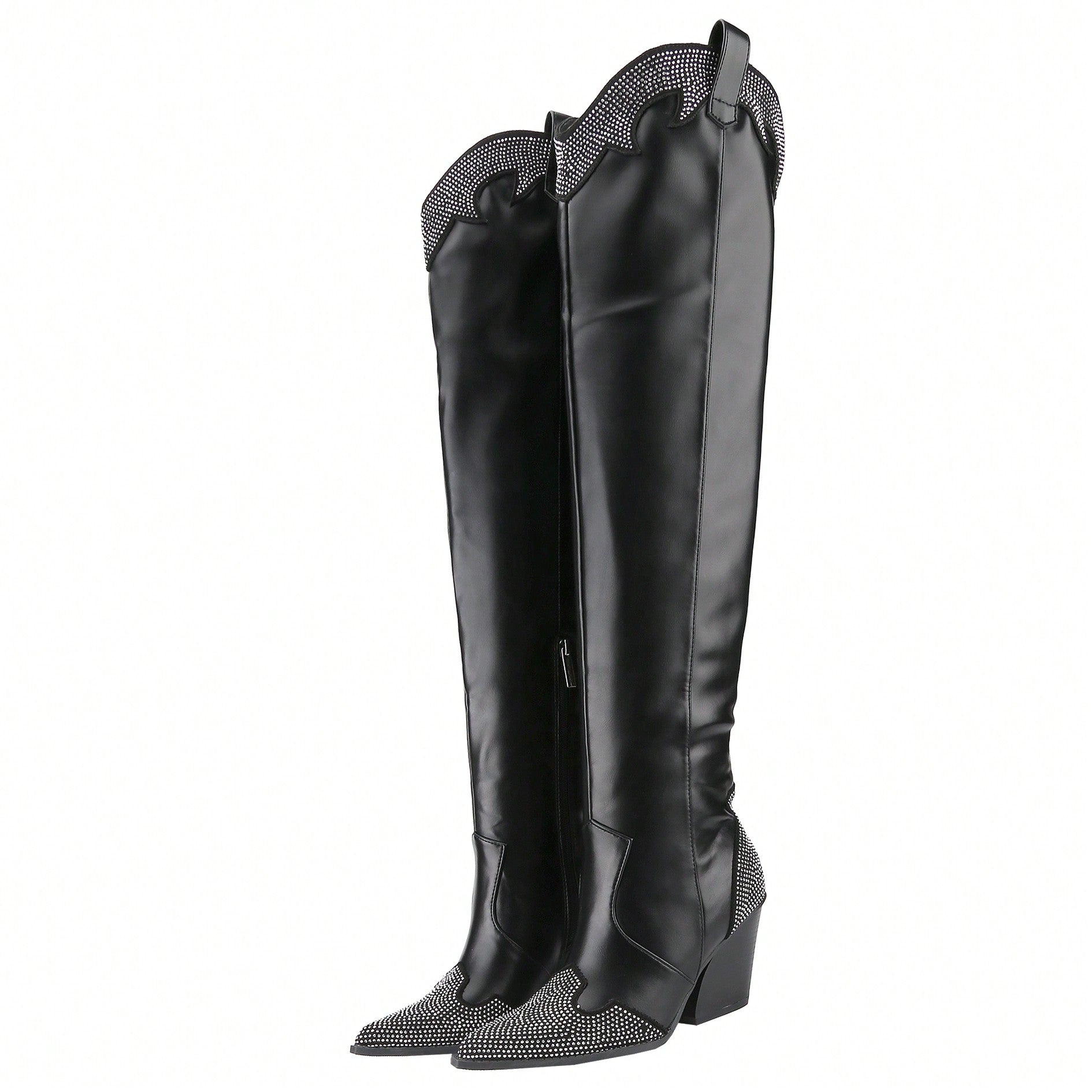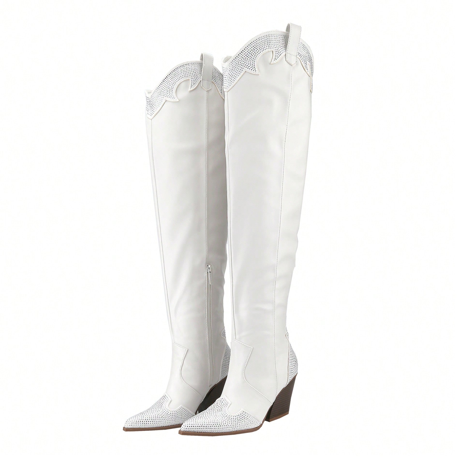 Women's Rhinestone Cowboy Boots Western Cowgirl Boots Chunky Heel Pointed Toe Pull-on Over The Knee High Boots