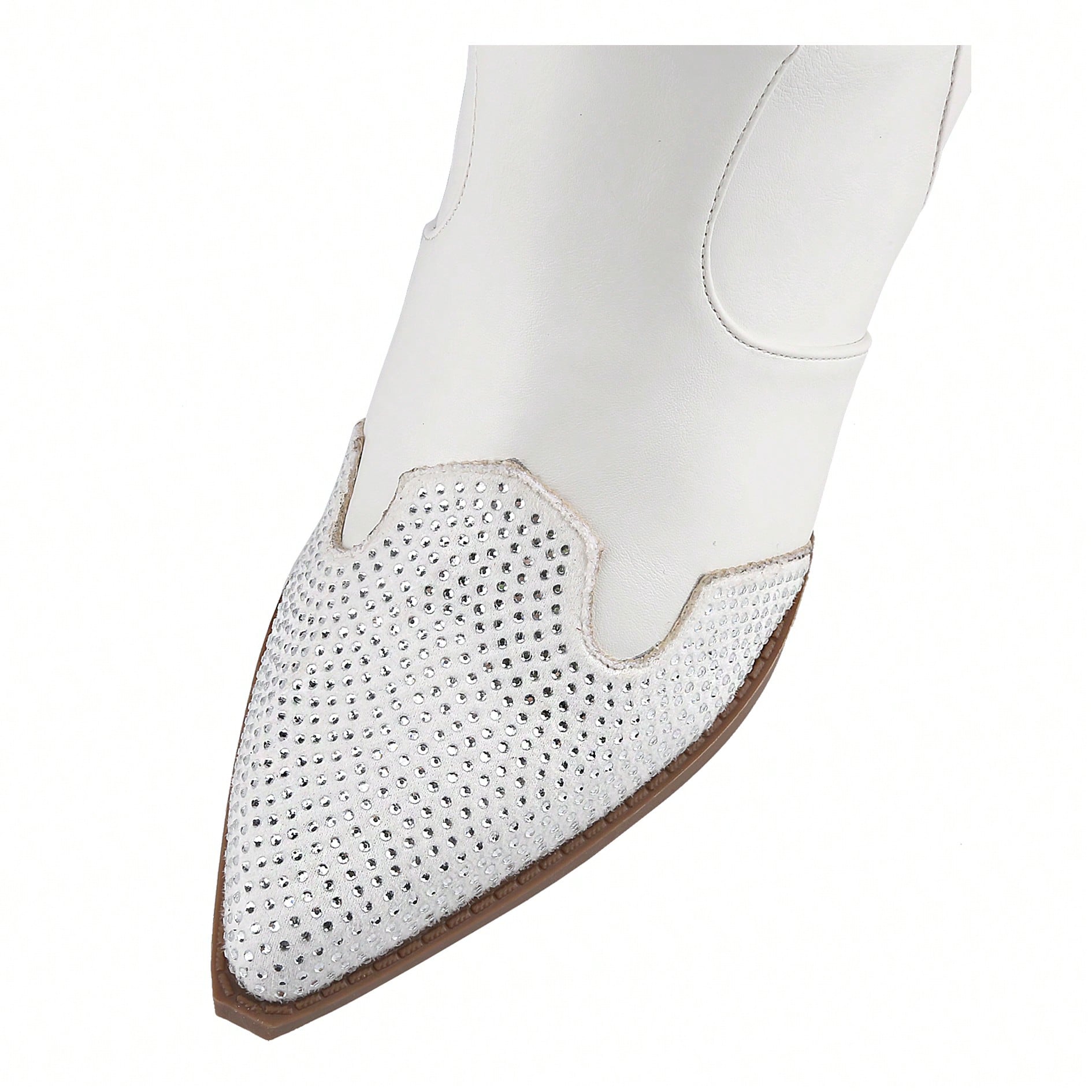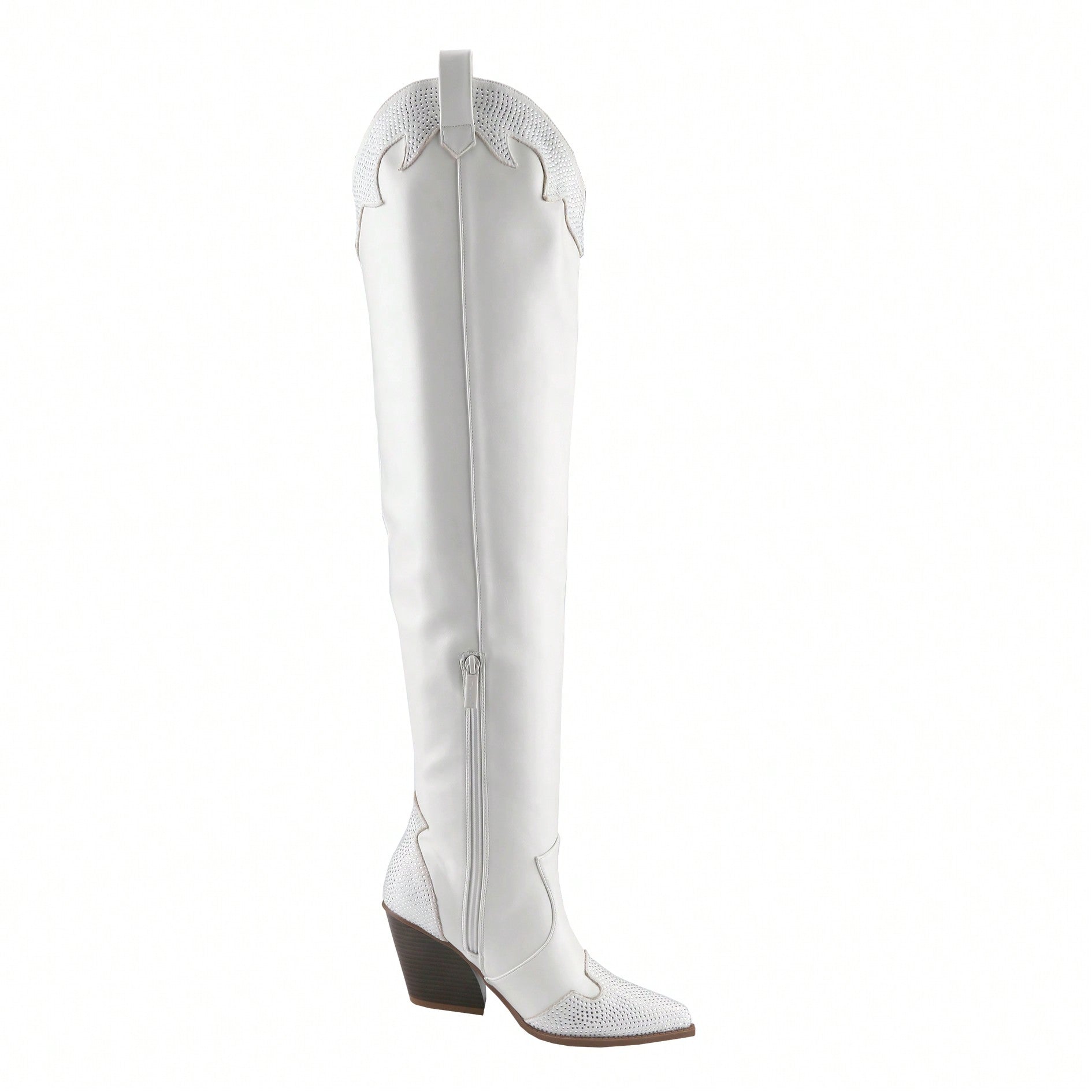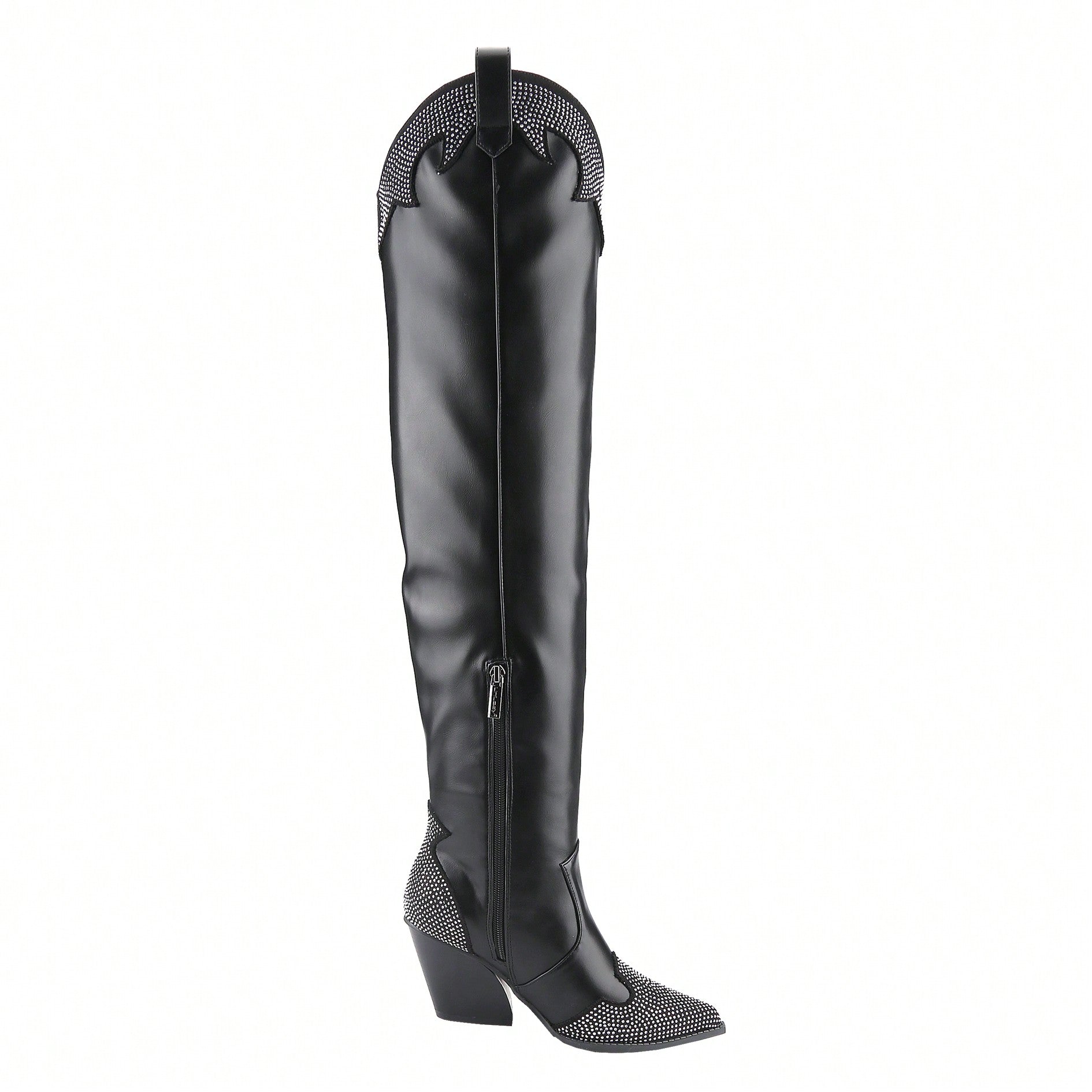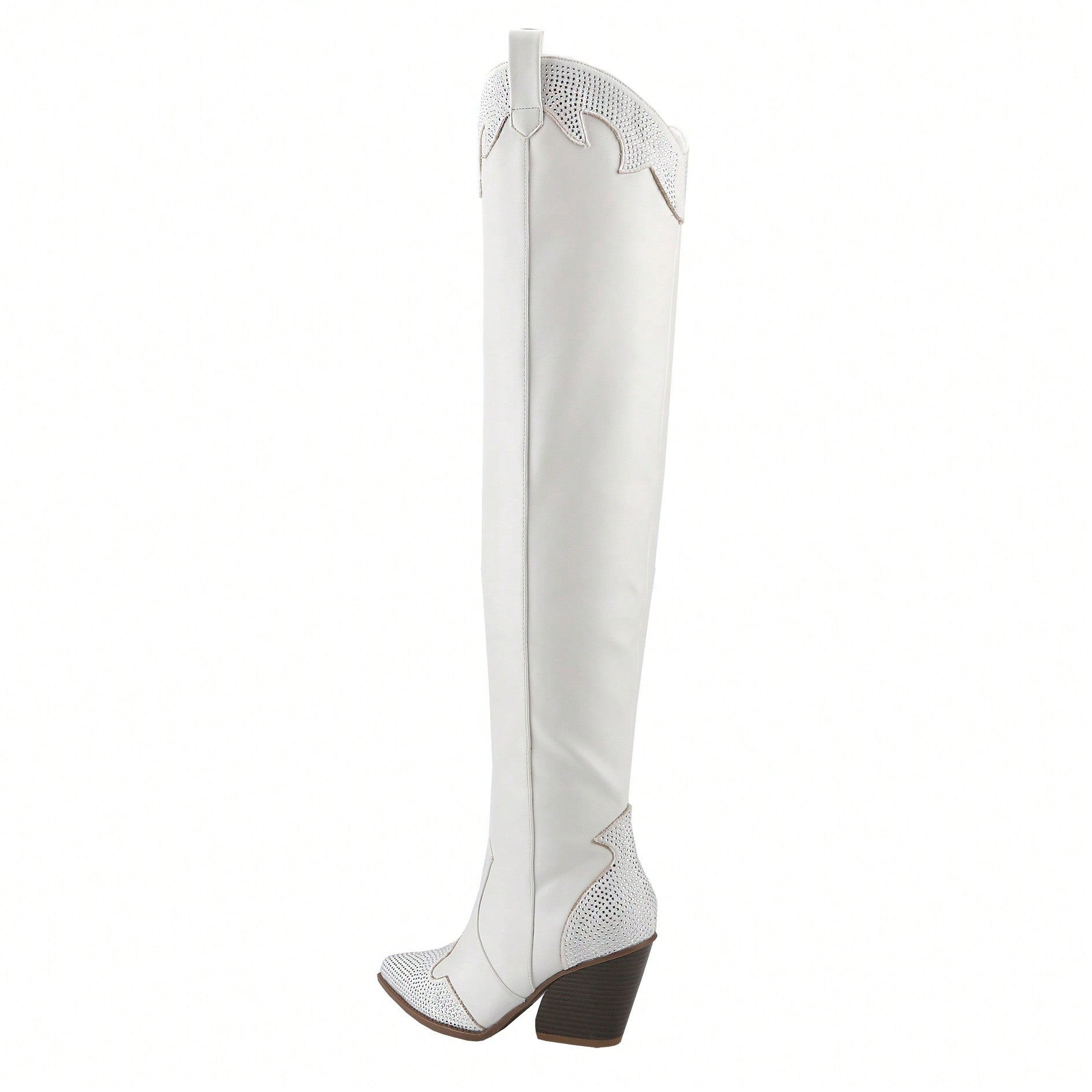 Women's Rhinestone Cowboy Boots Western Cowgirl Boots Chunky Heel Pointed Toe Pull-on Over The Knee High Boots