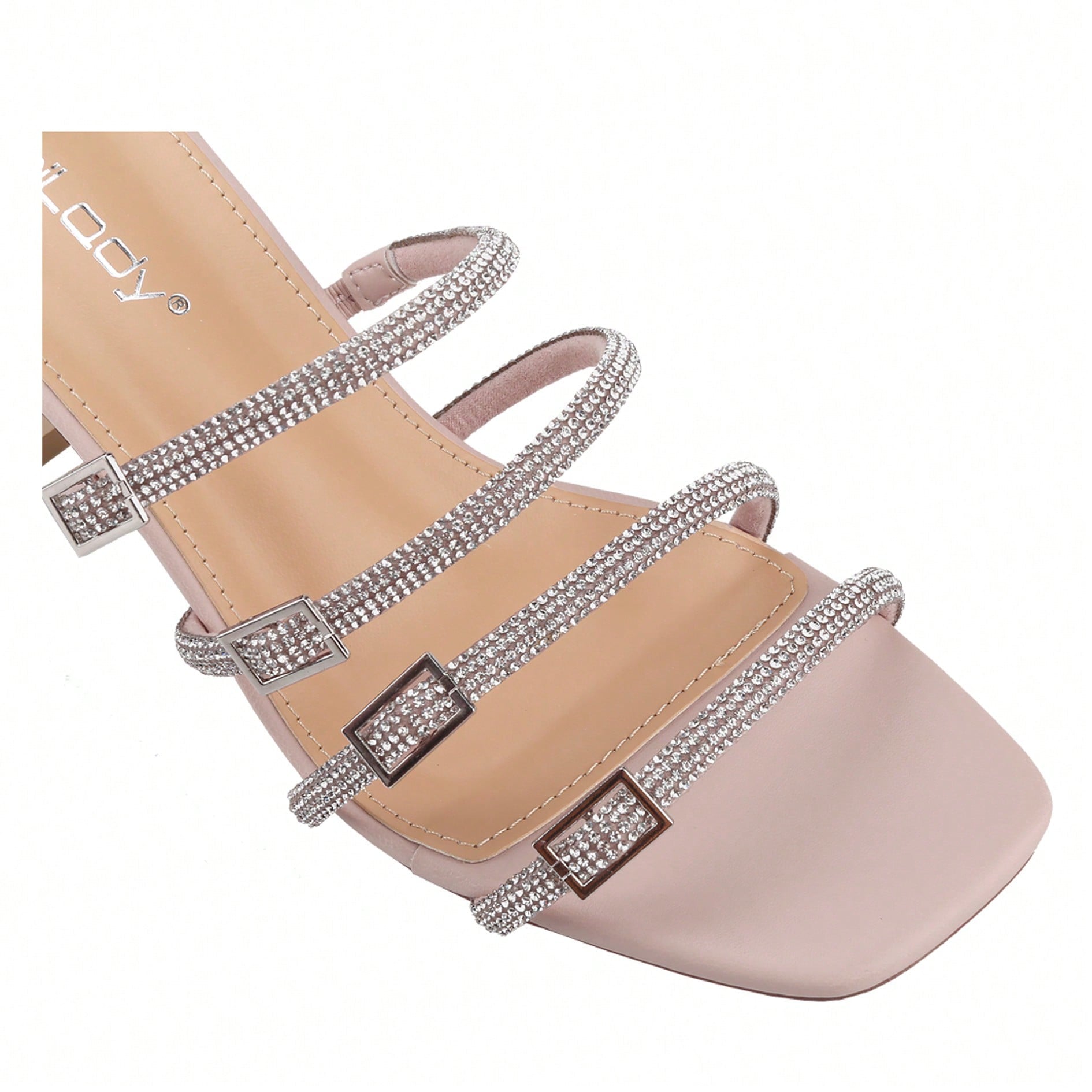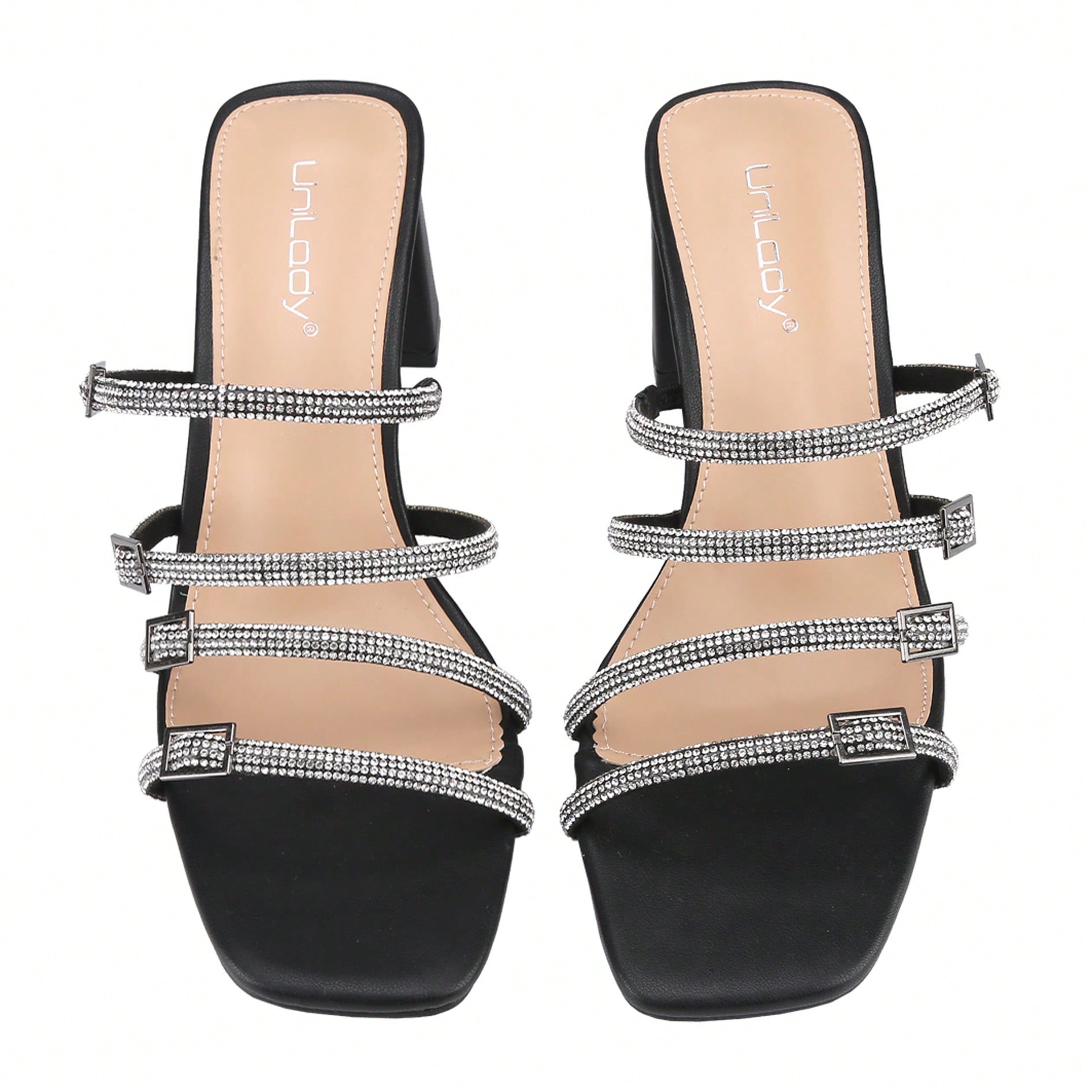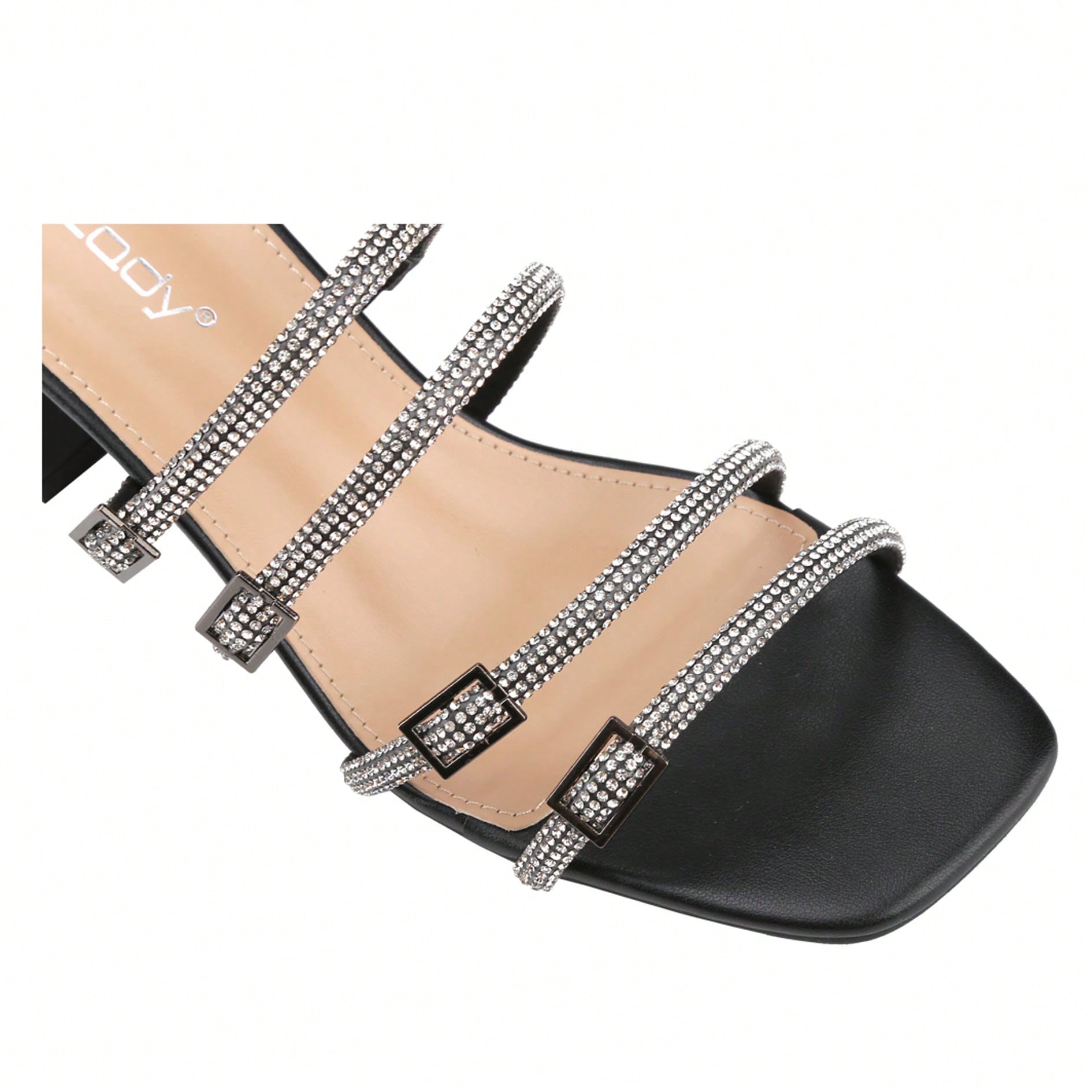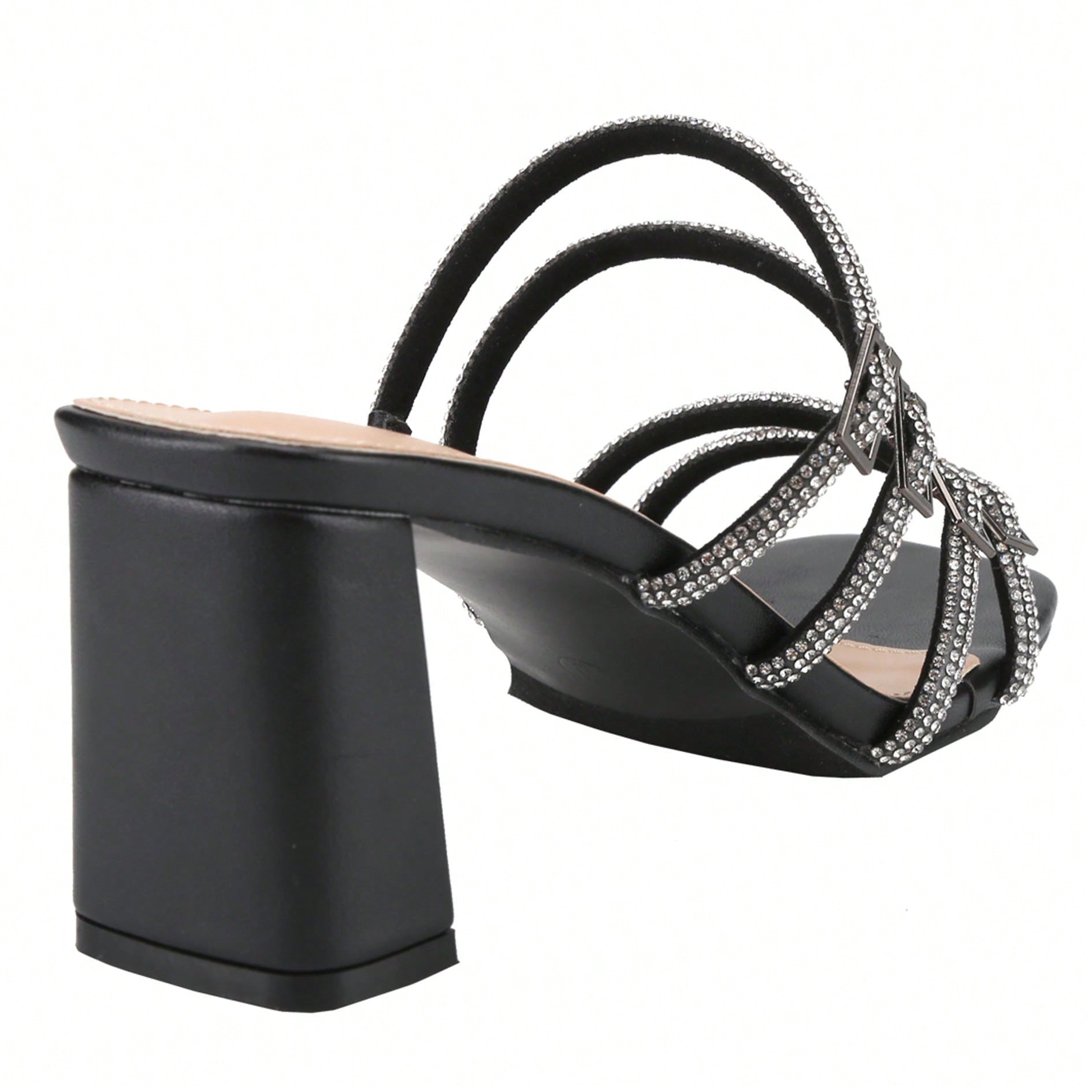 Women's Slip On Square Toe Chunky Heels Sandals, Strappy Buckle With Rhinestone