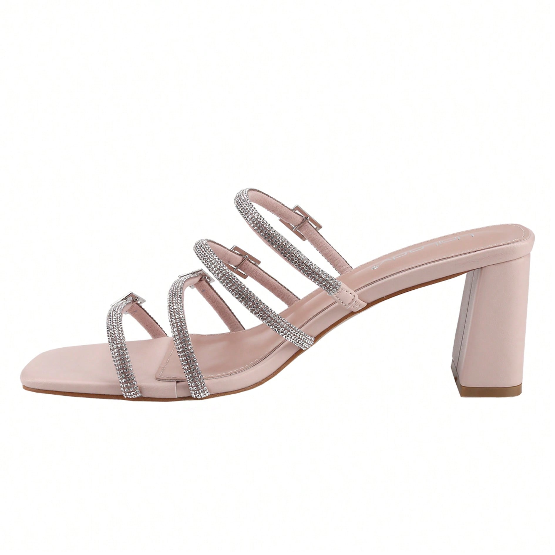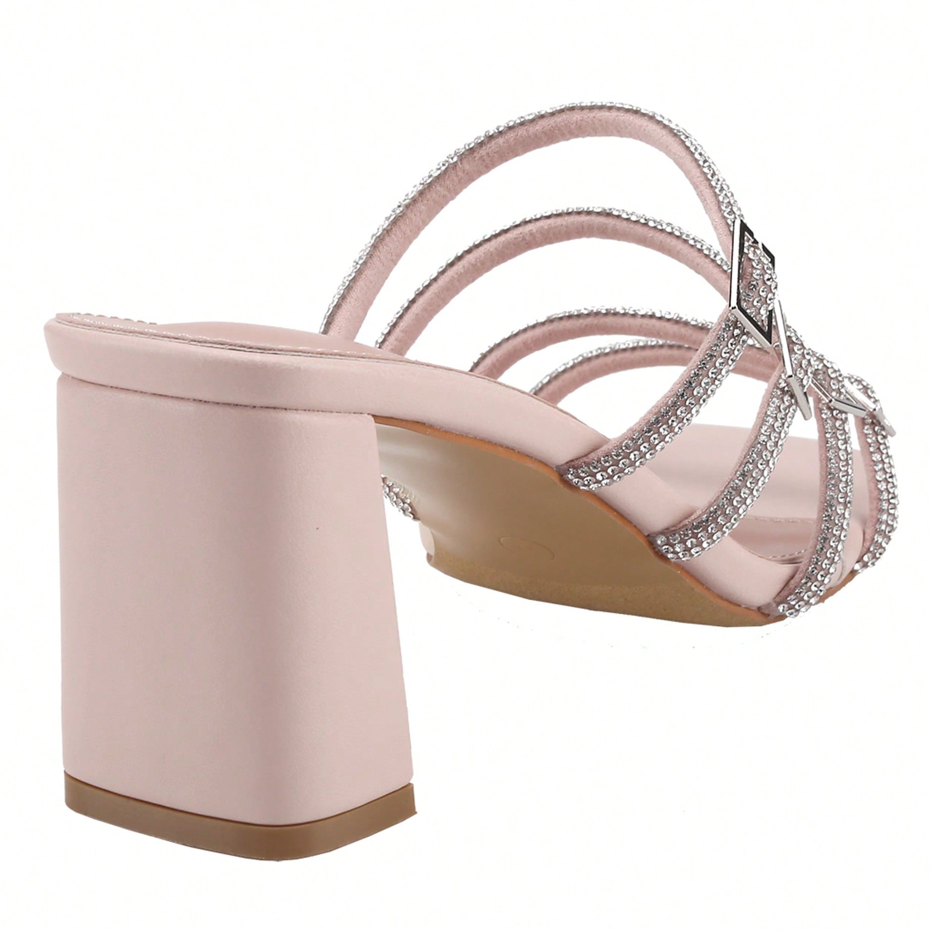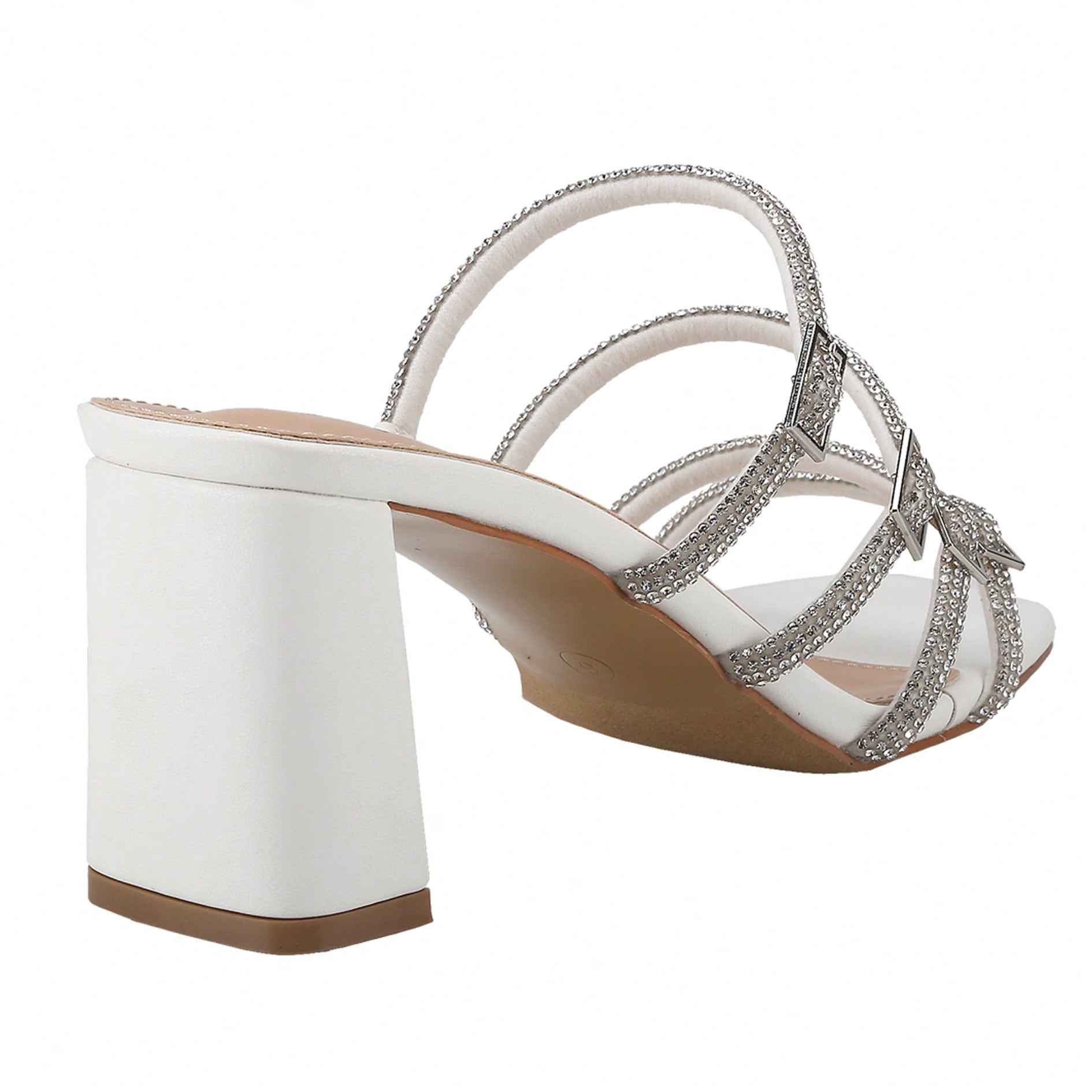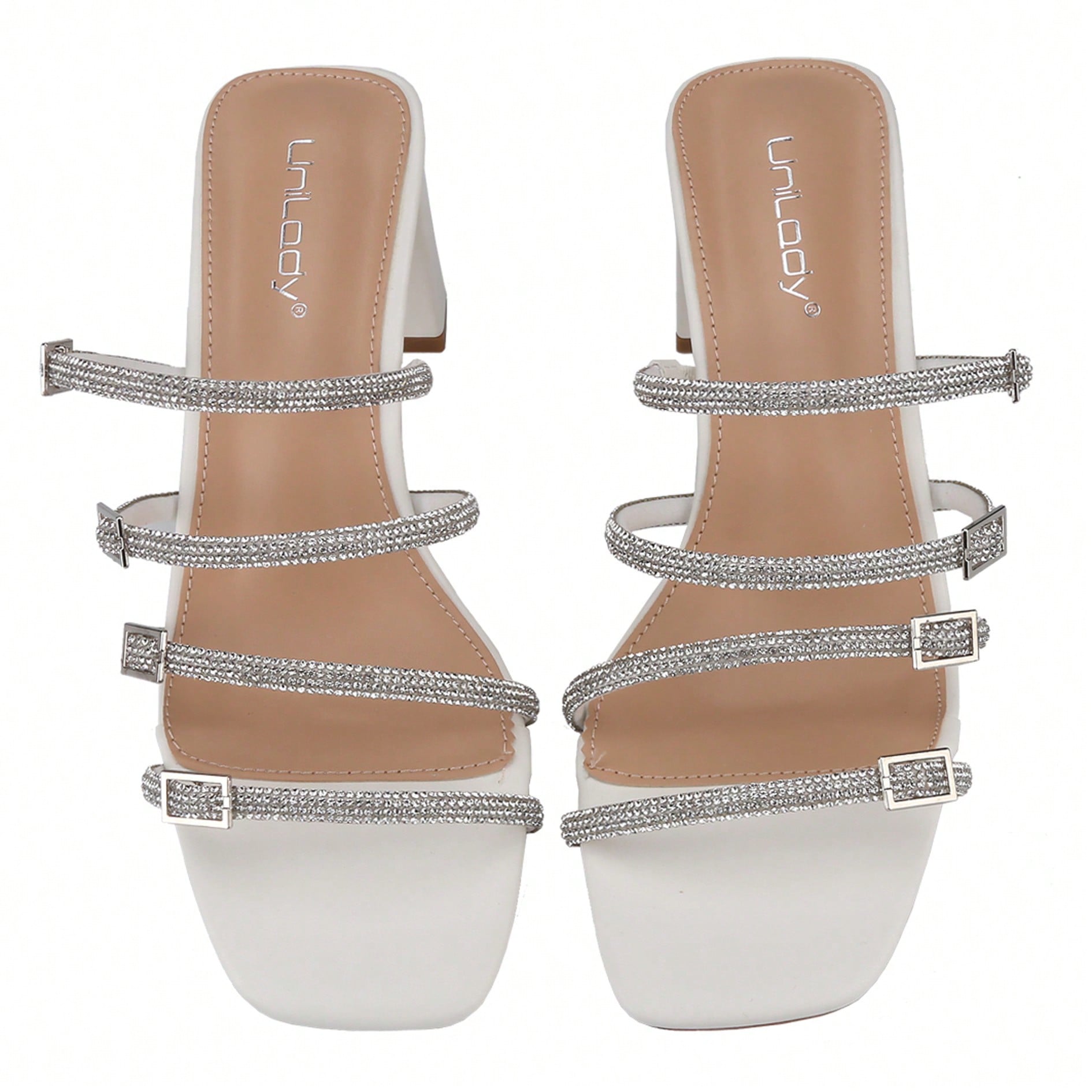 Women's Slip On Square Toe Chunky Heels Sandals, Strappy Buckle With Rhinestone