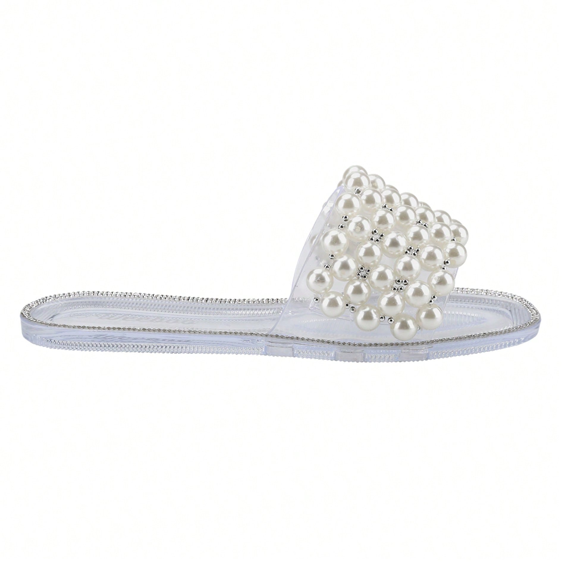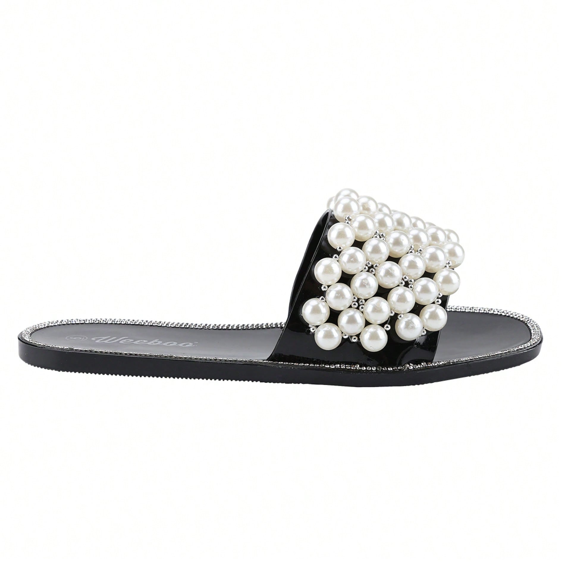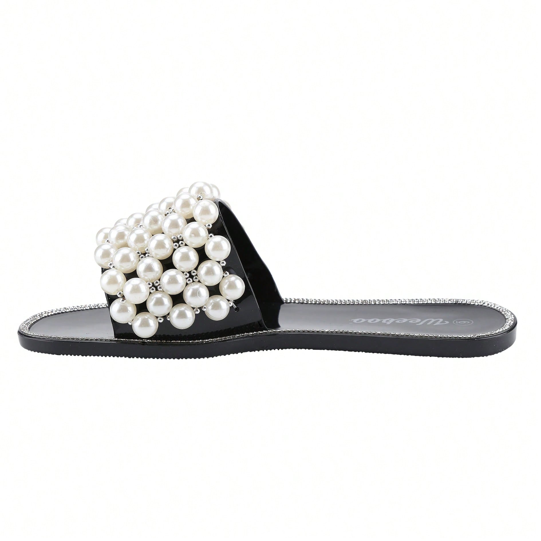 Women's Sparkle Pearl Flat Sandals Fashion Square Open Toe Jeweled Slides Slip On Rhinestone Bling Slippers