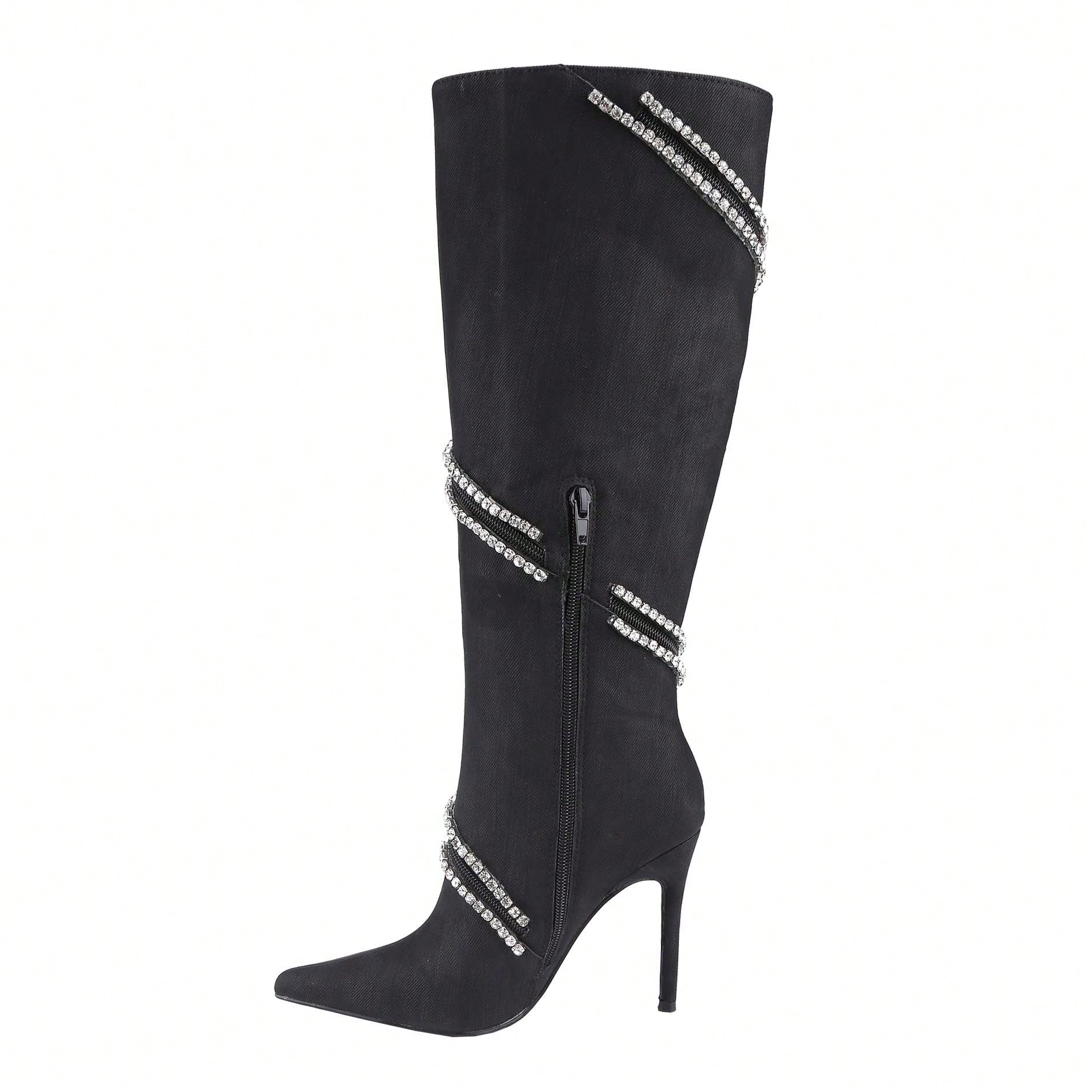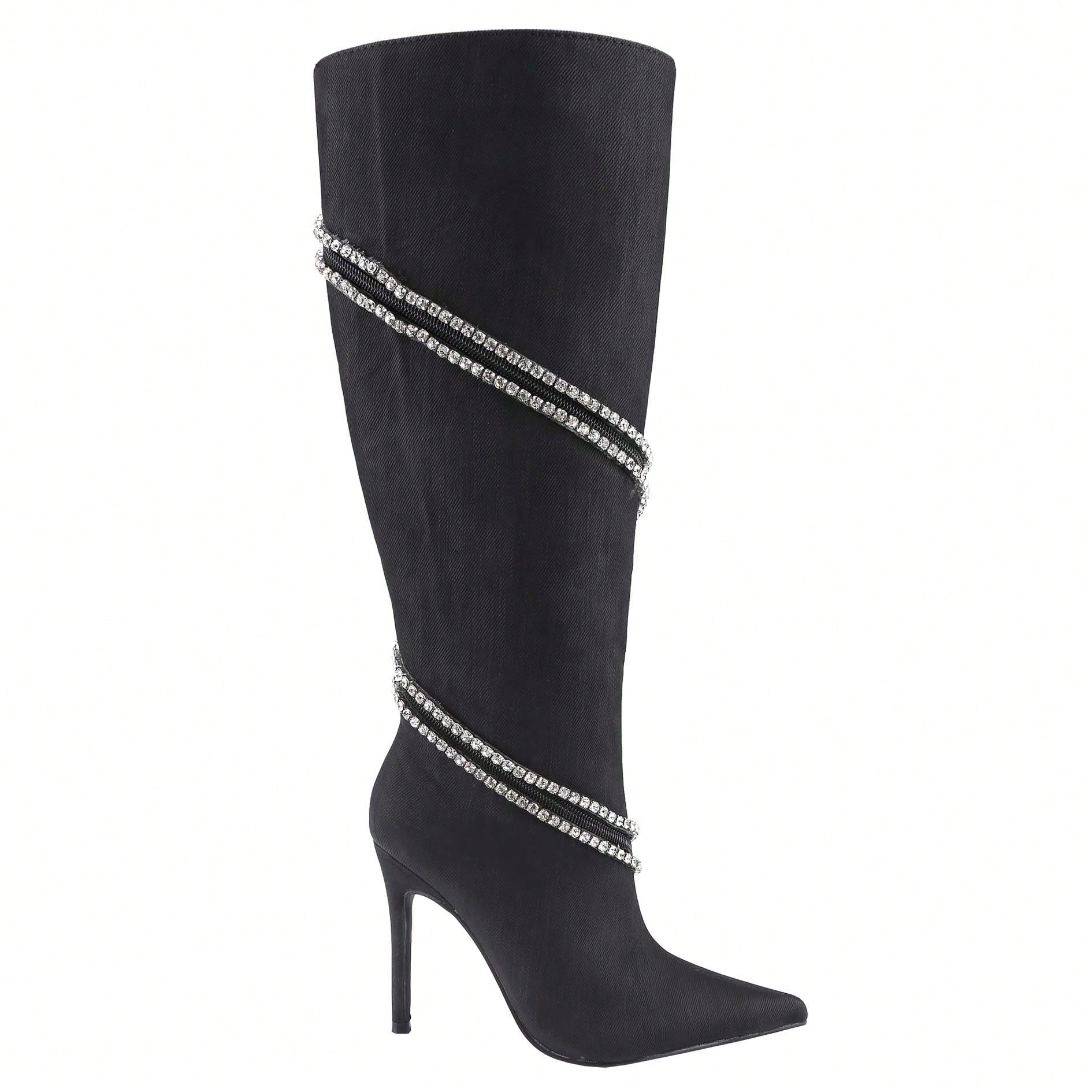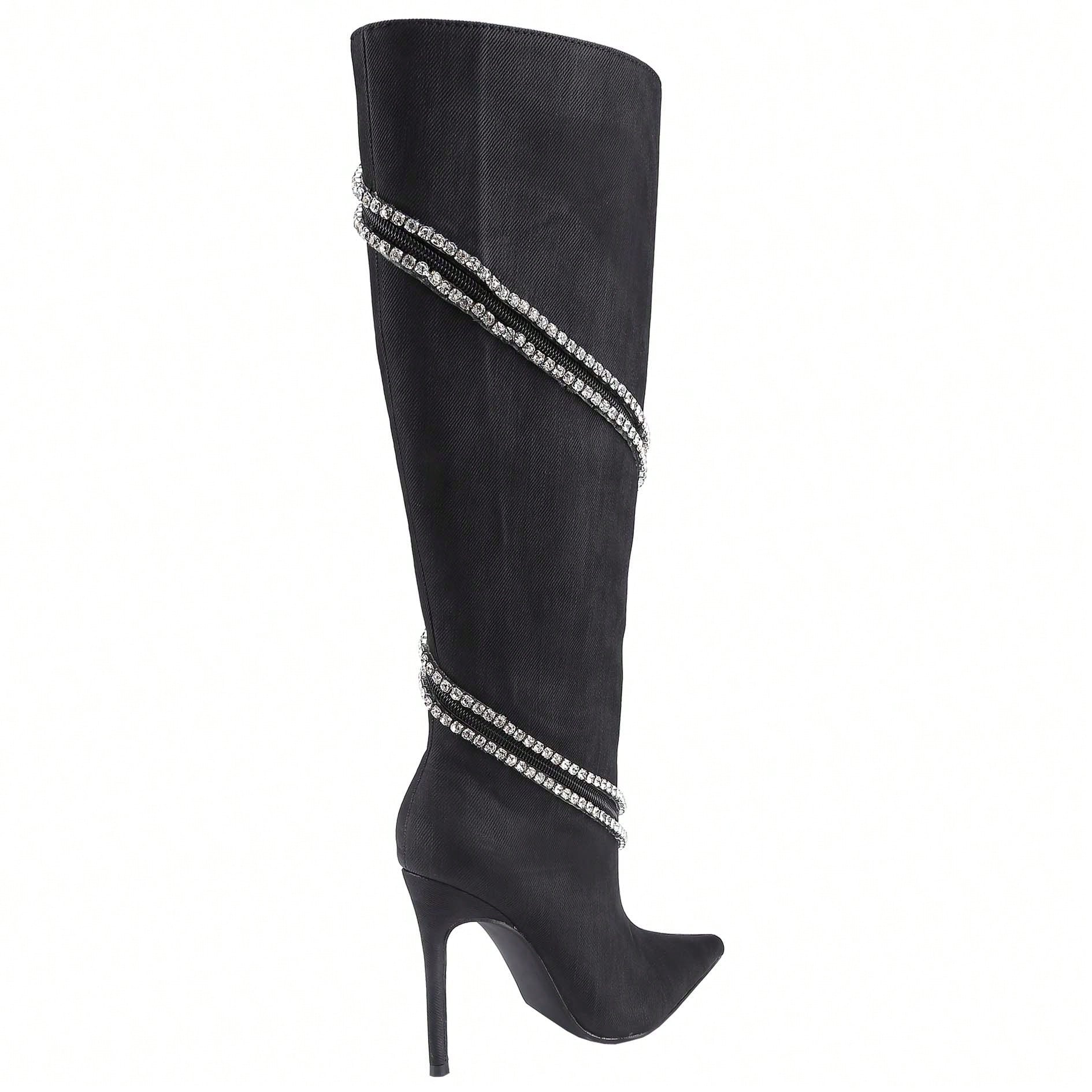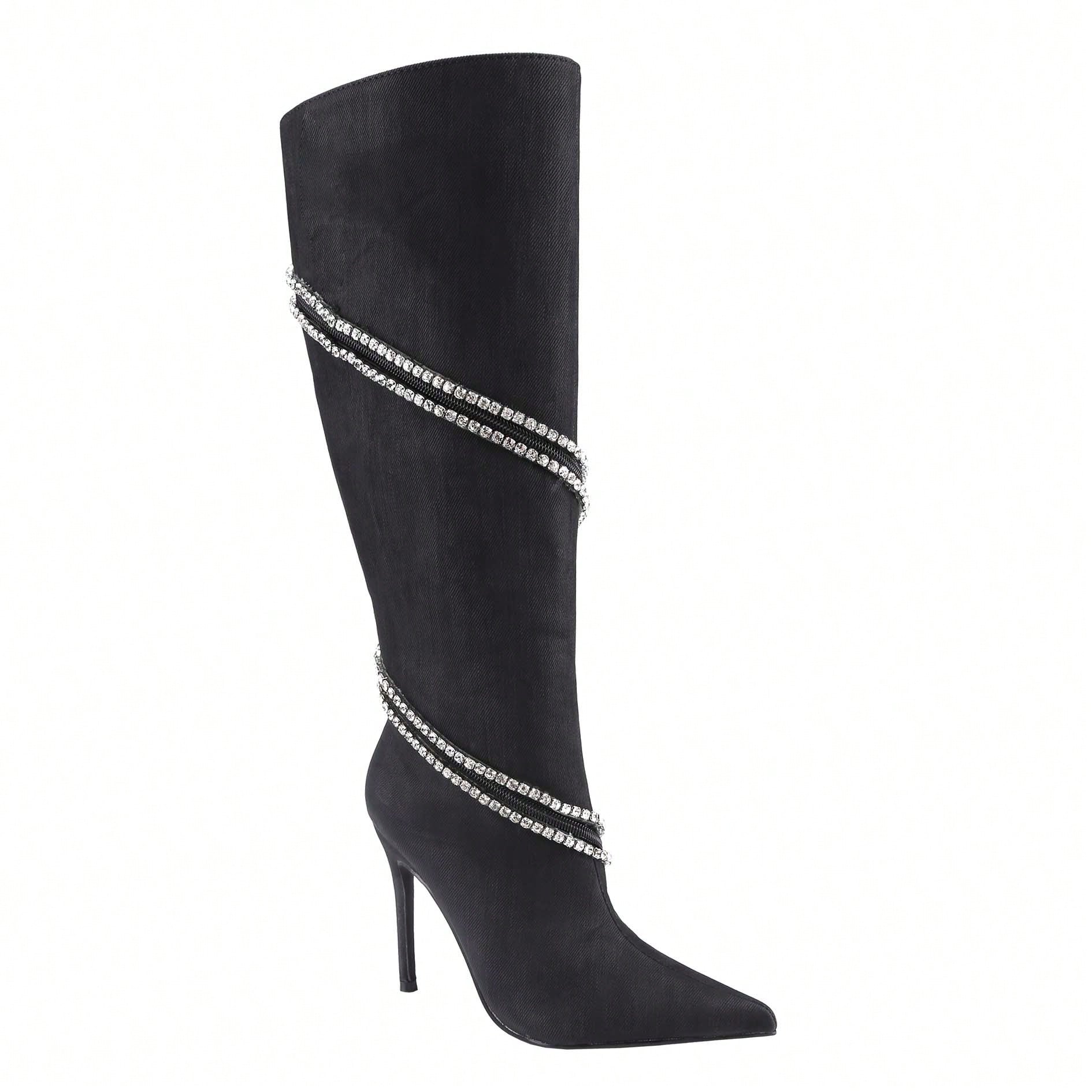 Women's Stiletto Boots Pointed Toe Crystal Straps Embellished Booties Slip-On Knee High Boots