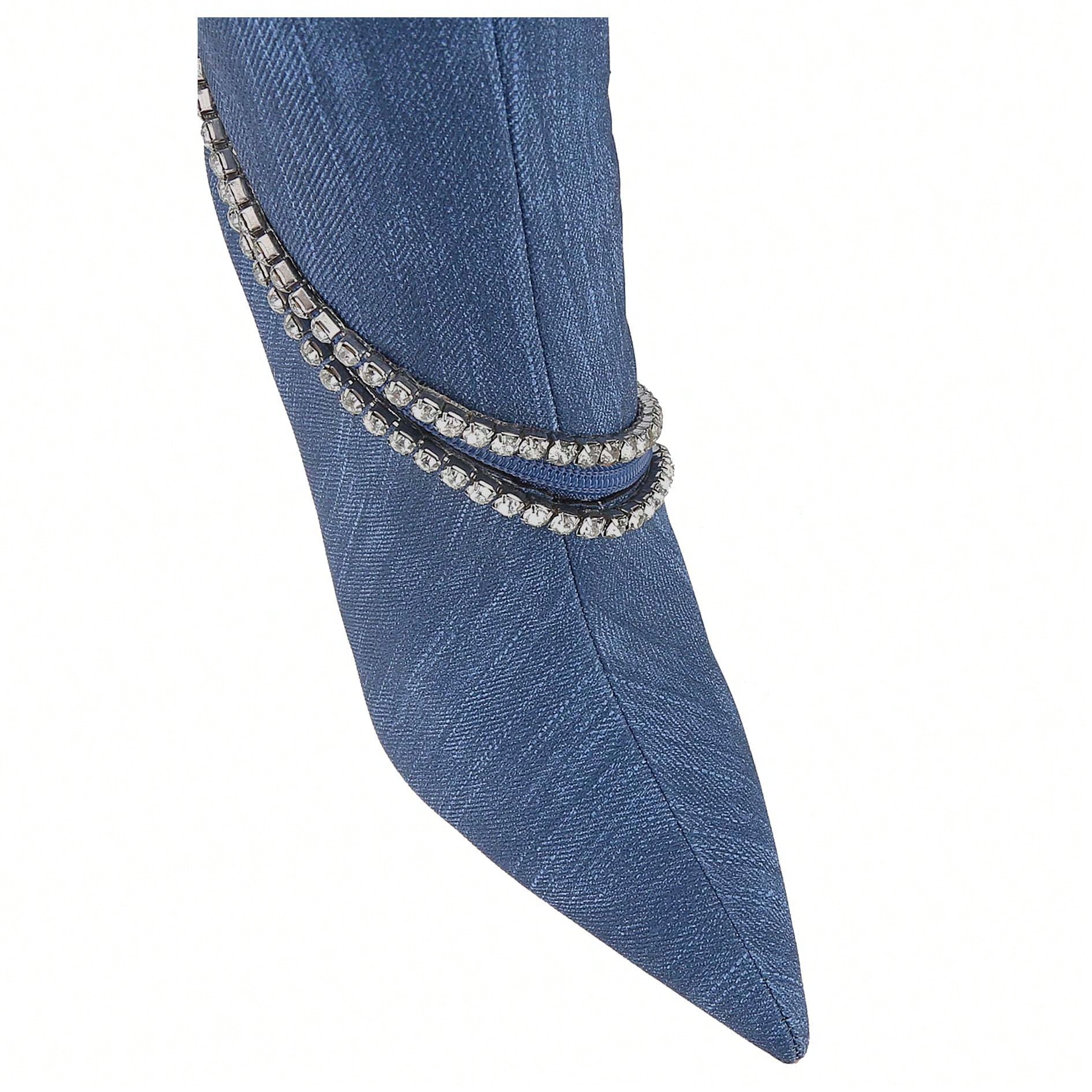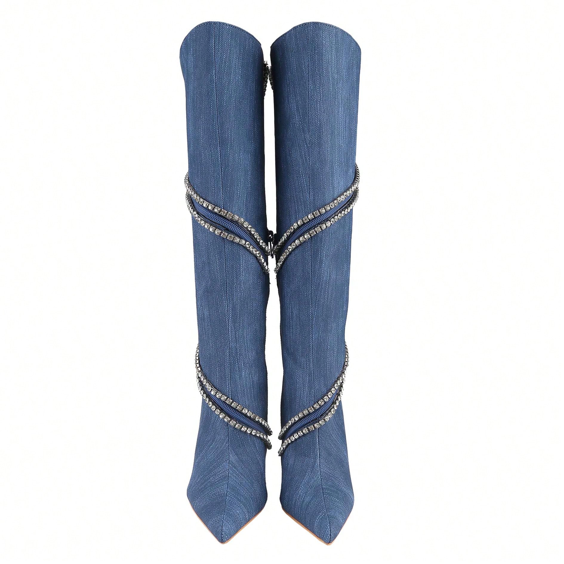 Women's Stiletto Boots Pointed Toe Crystal Straps Embellished Booties Slip-on Knee High Boots